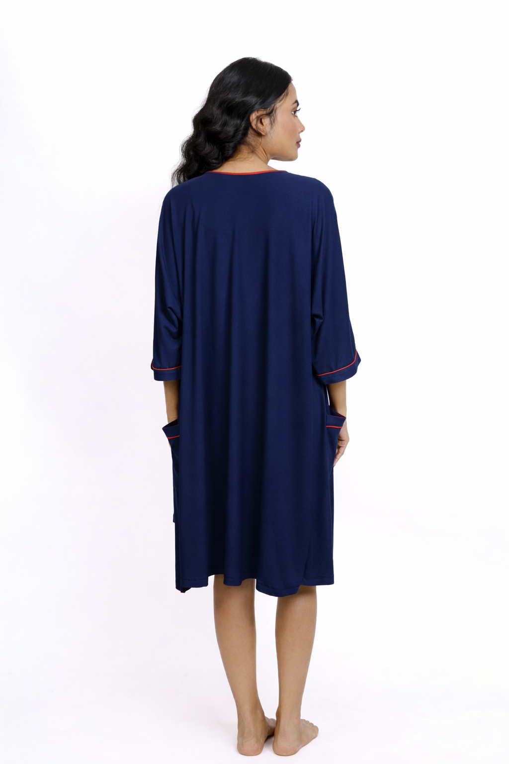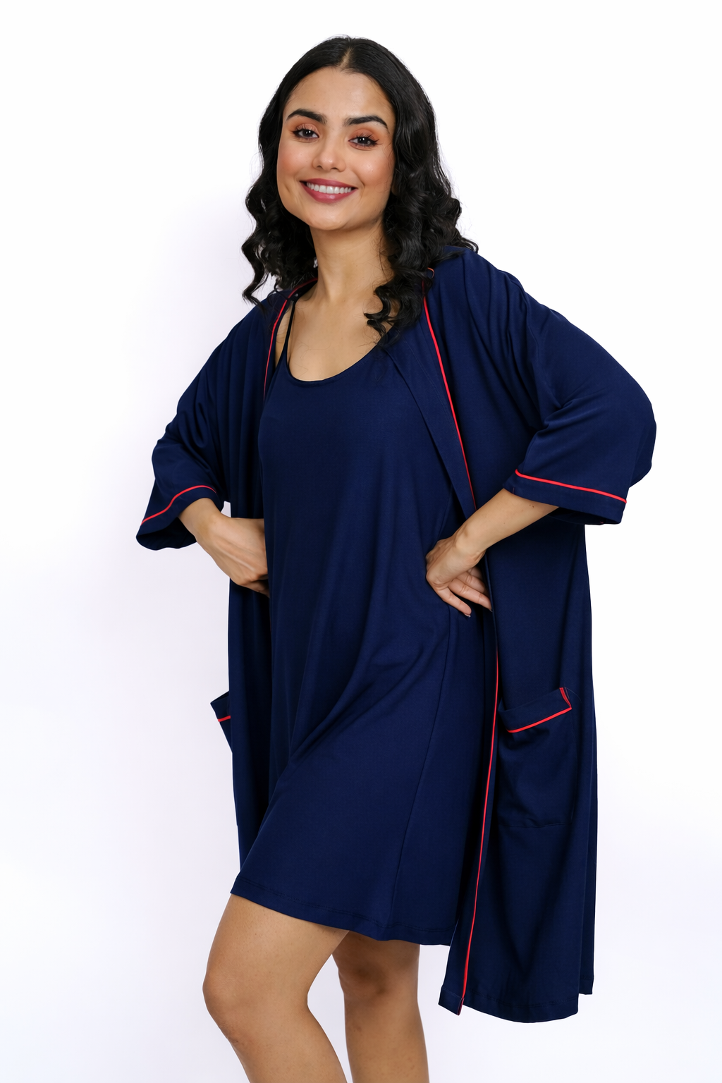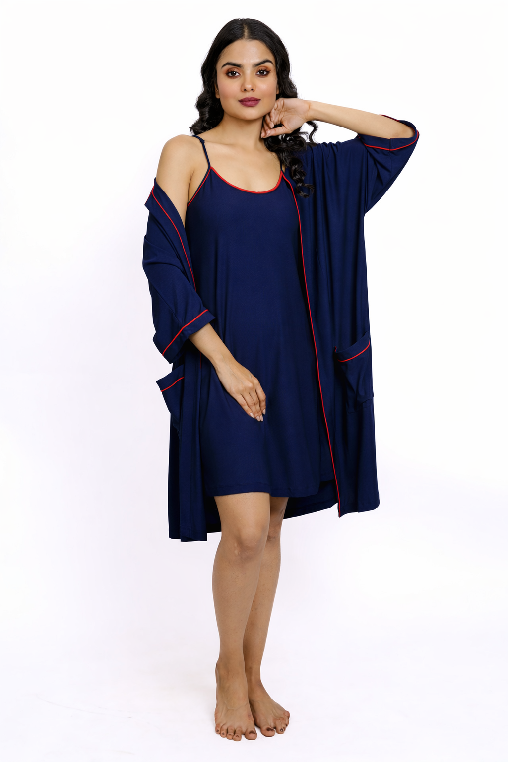 Slip into effortless elegance with the Crimson Comfort nightwear set, designed to bring ease and sophistication to your bedtime routine. This two-piece set features a soft, strappy nightdress paired with a relaxed-fit robe, perfect for cozy nights in or lazy weekend mornings. The robe's open front with functional pockets adds a touch of practicality to this chic ensemble.