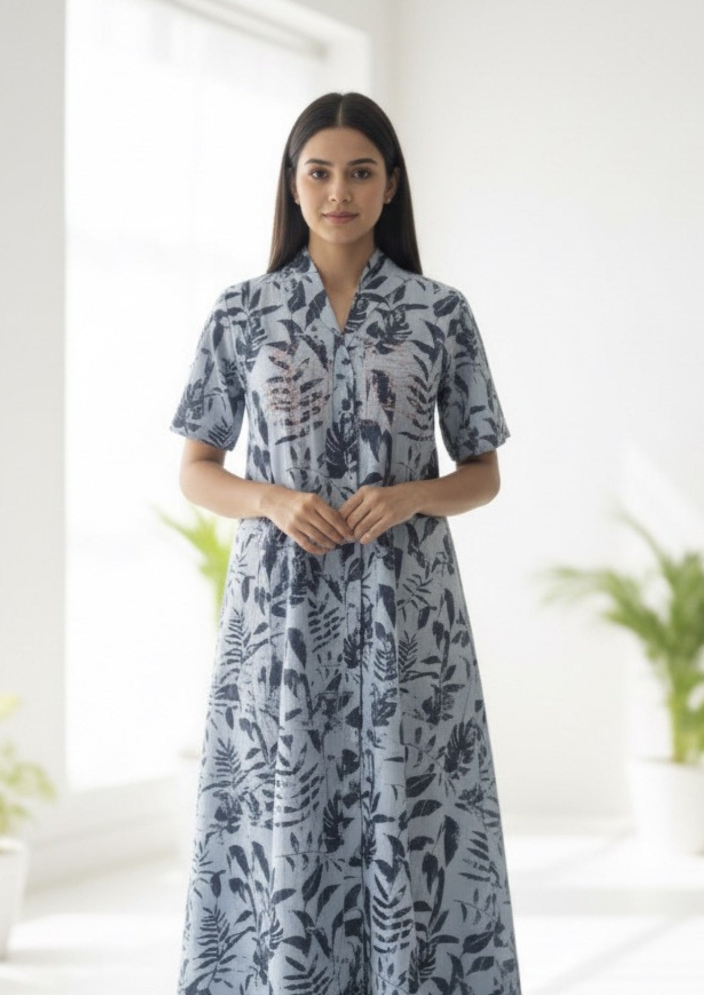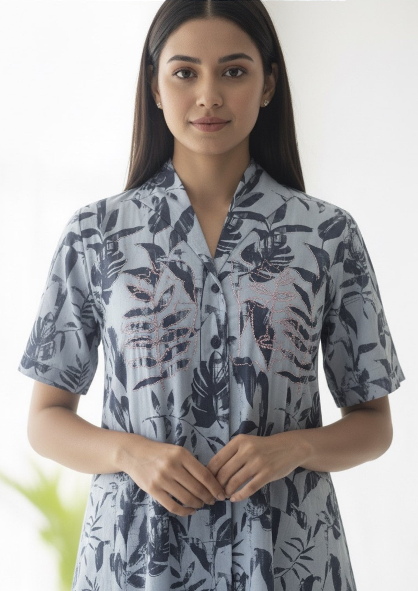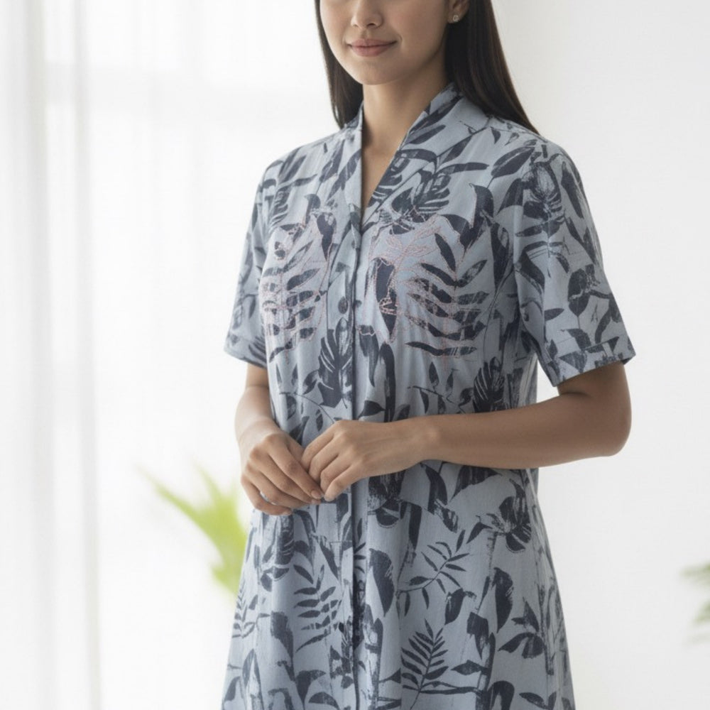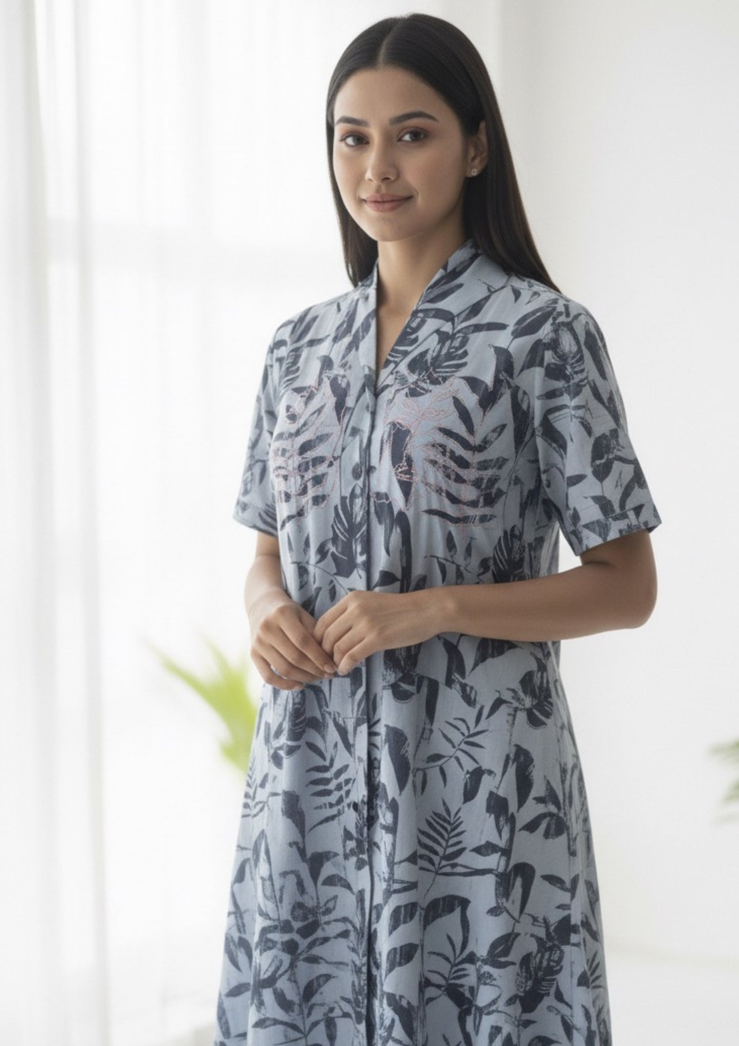 Immerse yourself in the calm elegance of the Azure Bloom Embroidered Nighty, where modern comfort meets artisanal charm. Crafted from breathable printed cotton, this piece features delicate hand embroidery across the chest, adding a touch of craftsmanship to its serene blue foliage pattern.