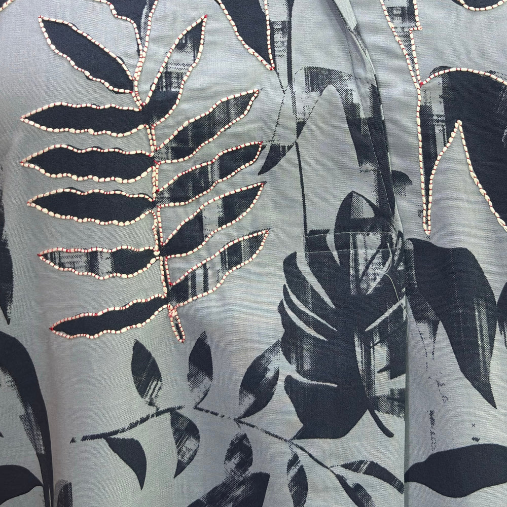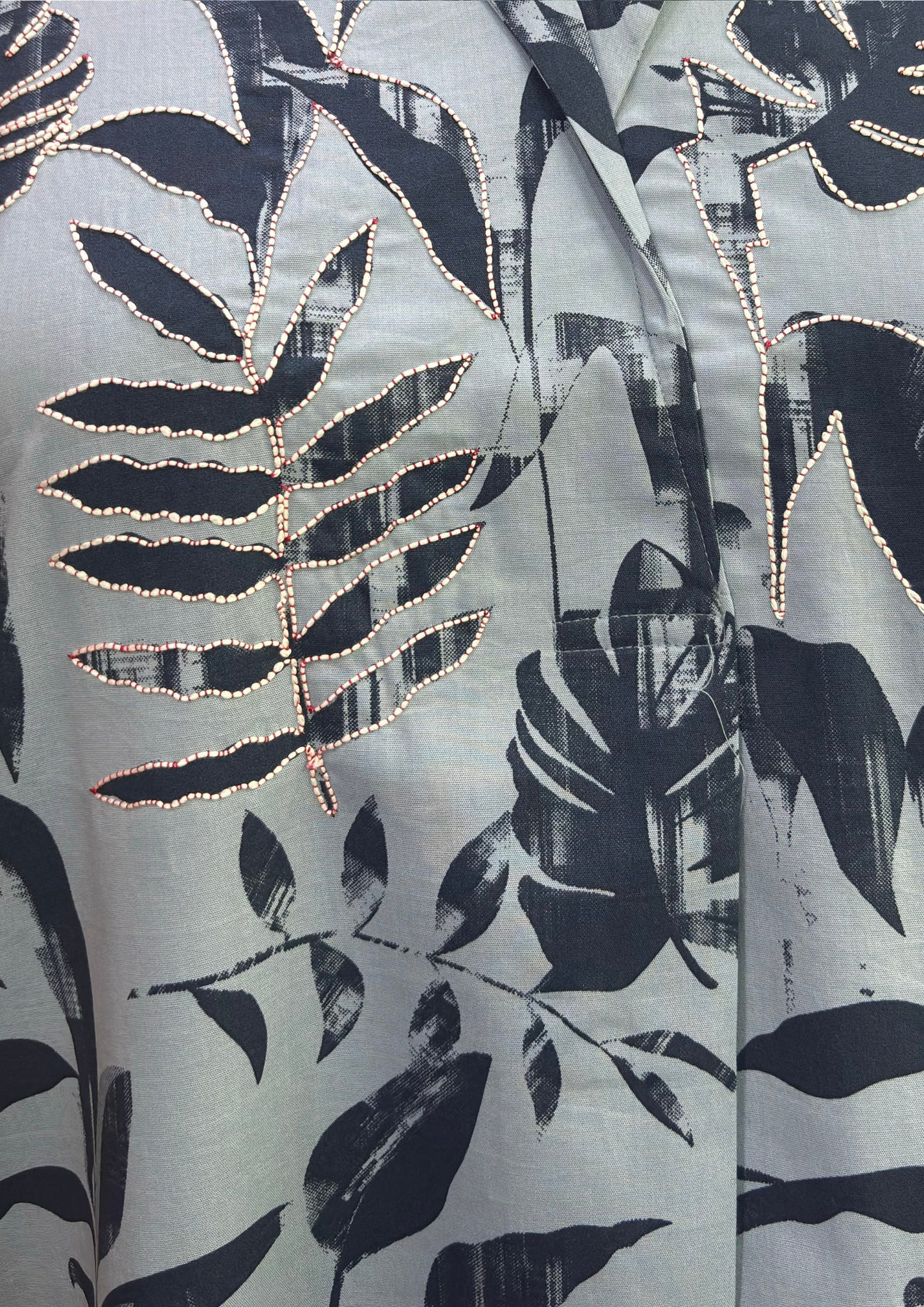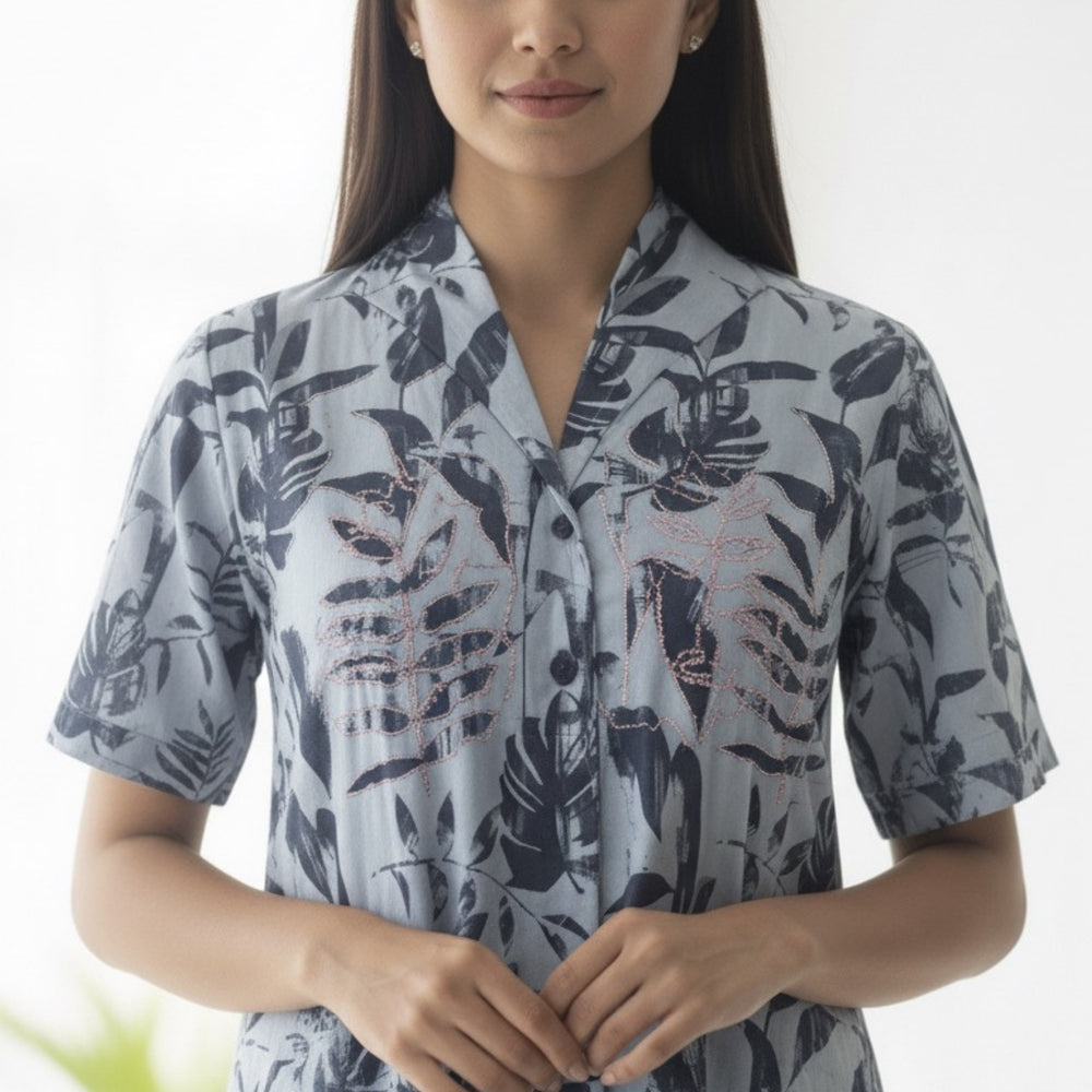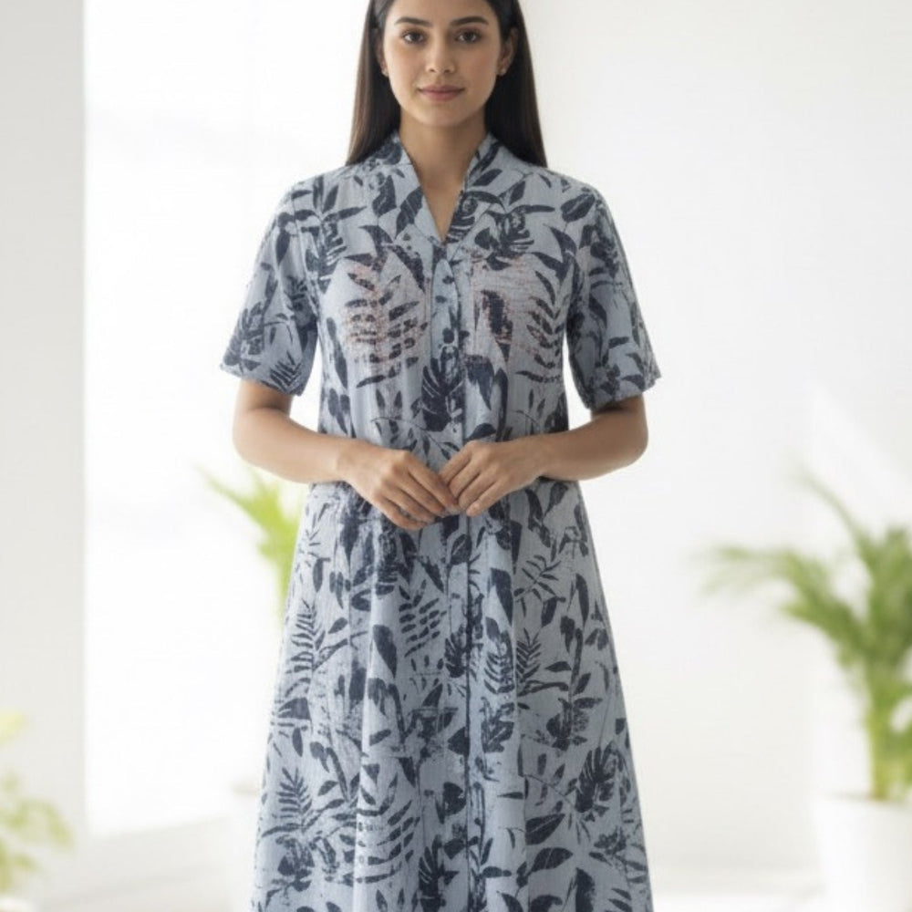 Immerse yourself in the calm elegance of the Azure Bloom Embroidered Nighty, where modern comfort meets artisanal charm. Crafted from breathable printed cotton, this piece features delicate hand embroidery across the chest, adding a touch of craftsmanship to its serene blue foliage pattern.
