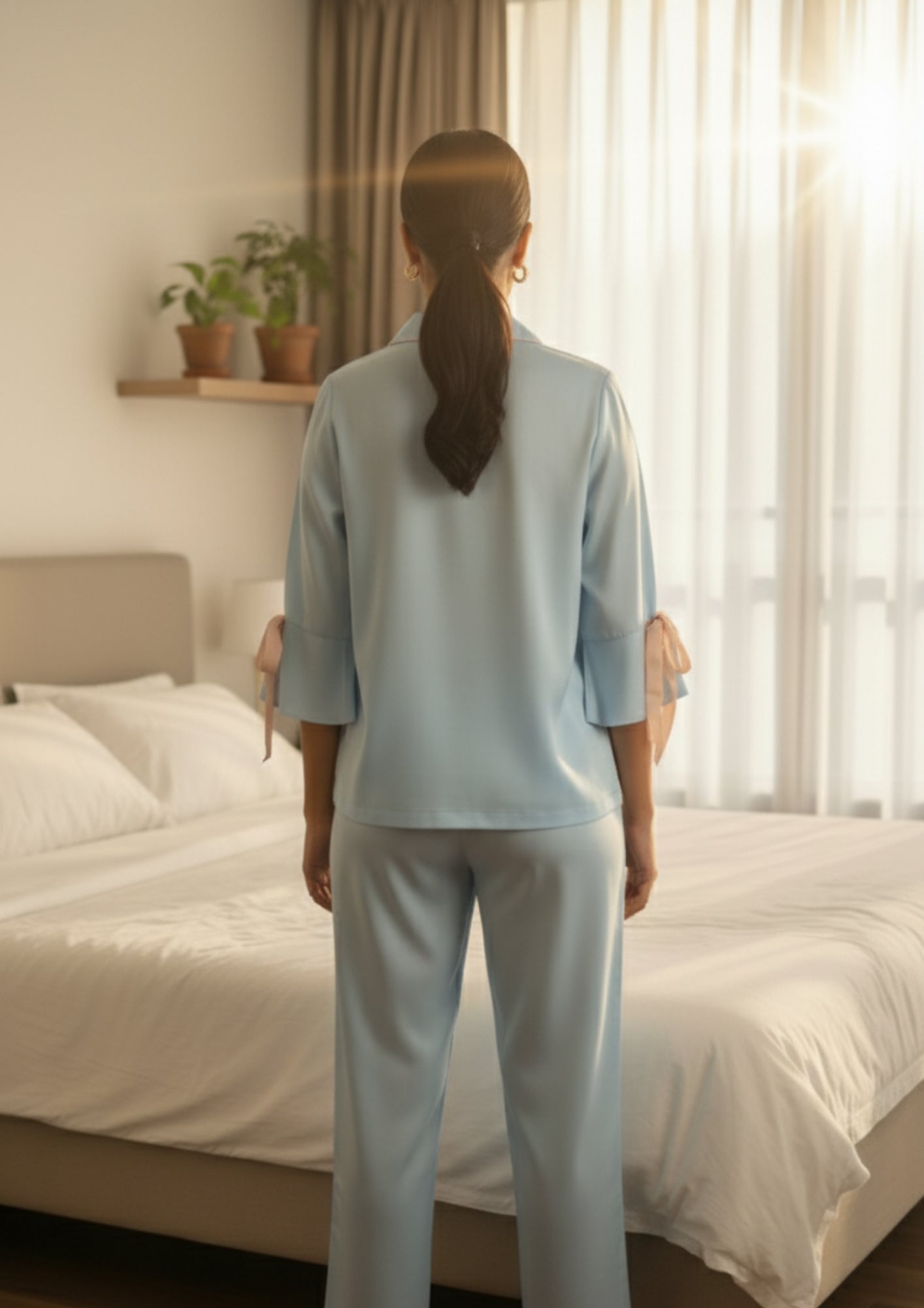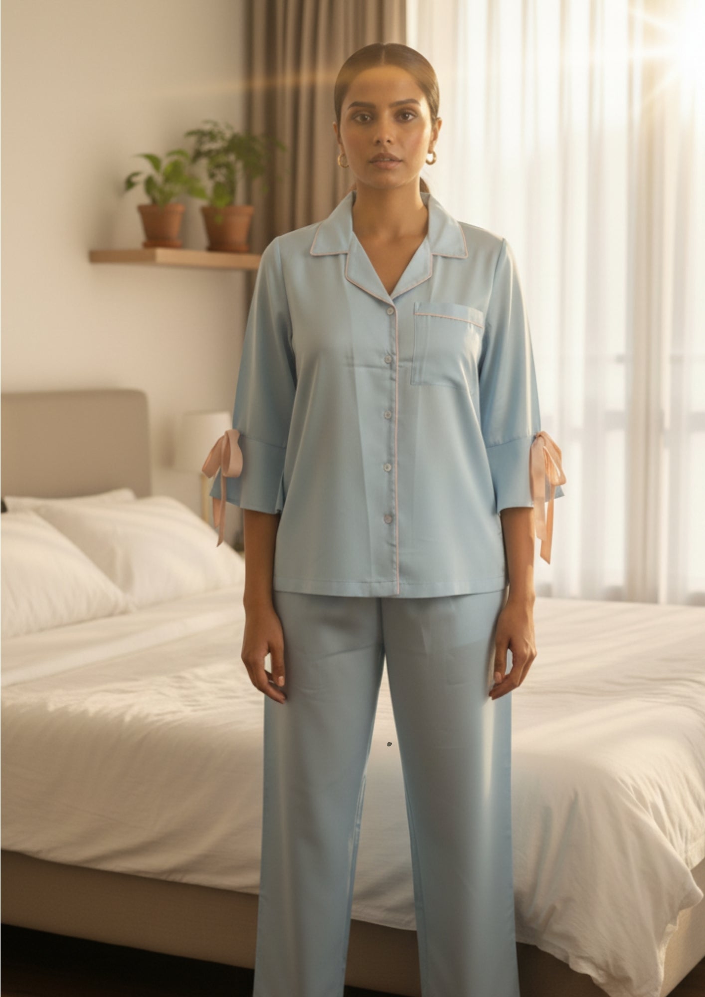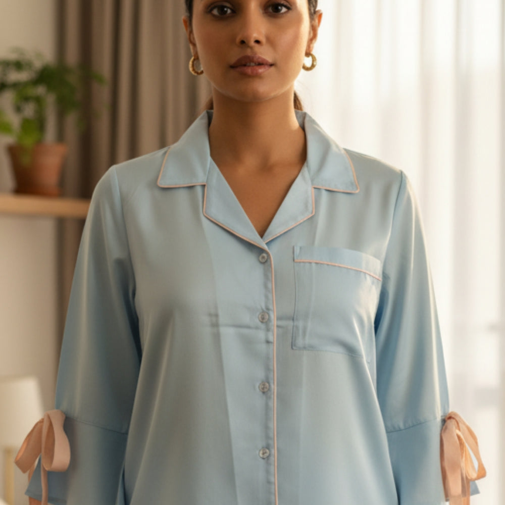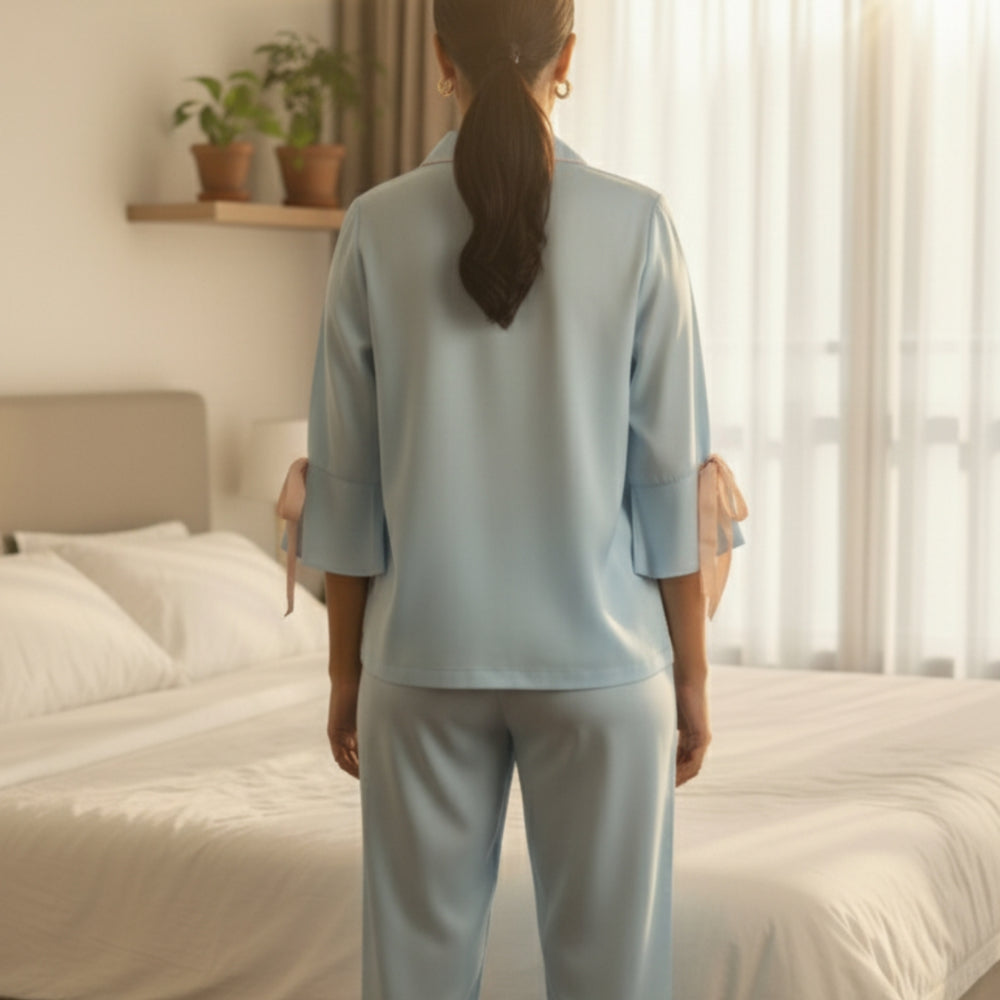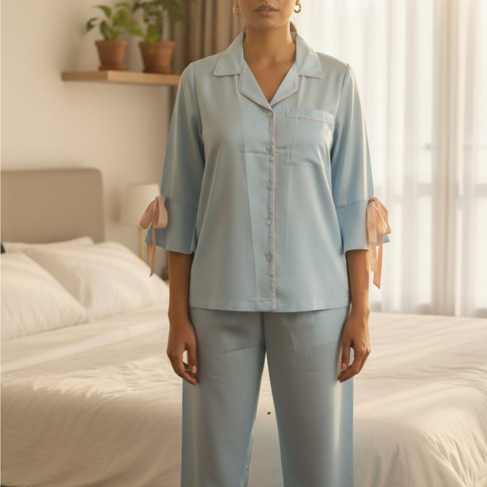 Breathe calm into your nights with the Powder Blue Bow-Tie Night Suit, designed for the woman who adores understated elegance. This soft satin-blend nightwear set comes in a soothing powder blue tone, elevated with delicate blush pink piping and charming bow details on the sleeves for a romantic touch.