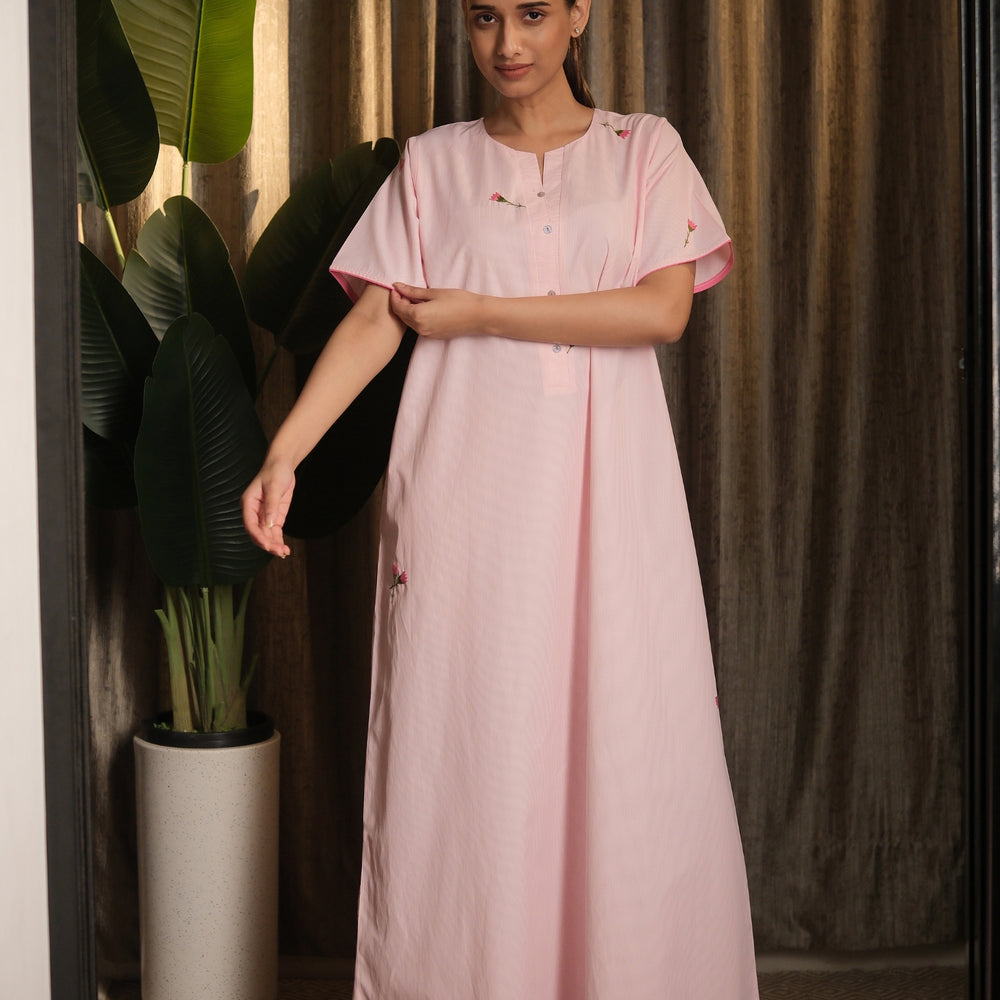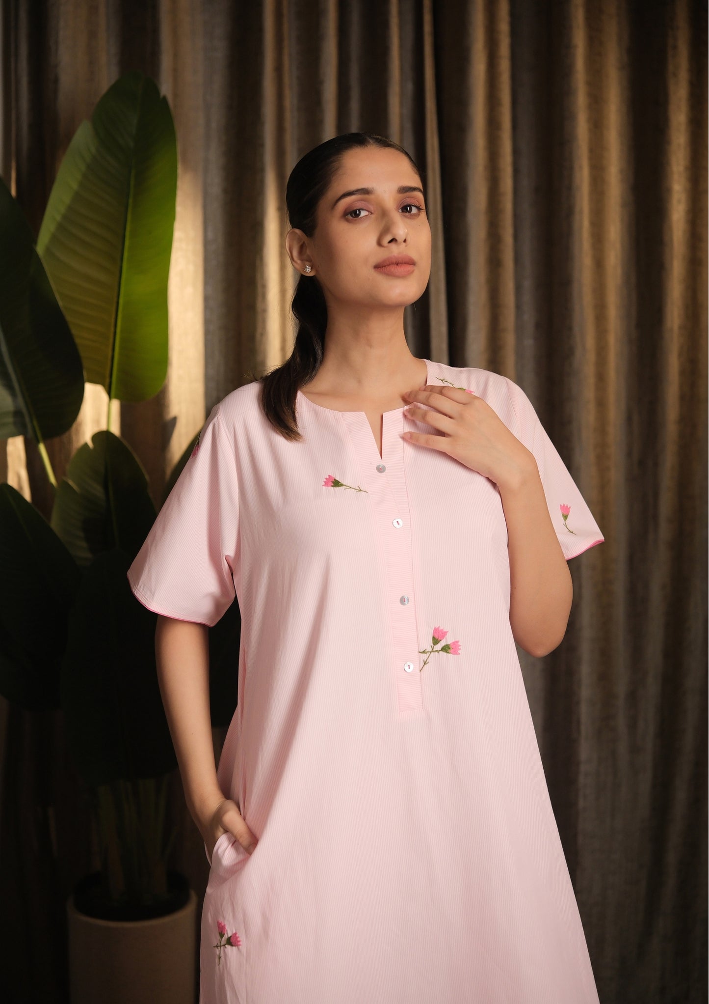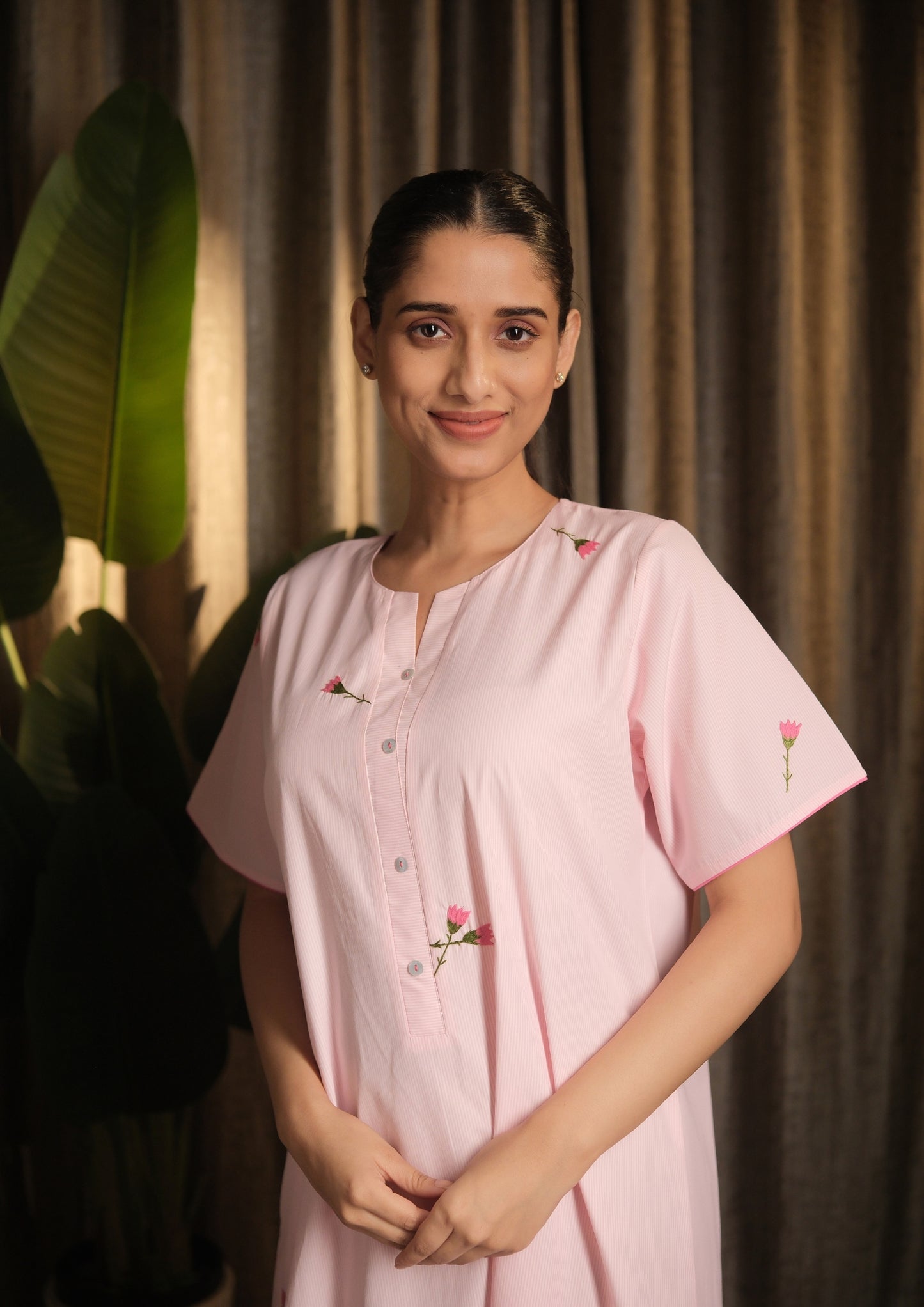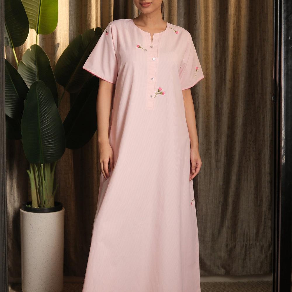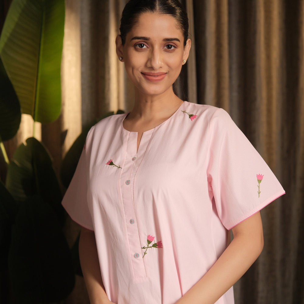 The Blush Petal Hand-Embroidered Nighty is where serenity meets sophistication. Crafted from soft striped cotton fabric, it offers a gentle texture that feels like a dream against your skin. The soothing blush pink hue is adorned with delicate hand-embroidered floral motifs, adding a touch of artisanal grace to your everyday nightwear.