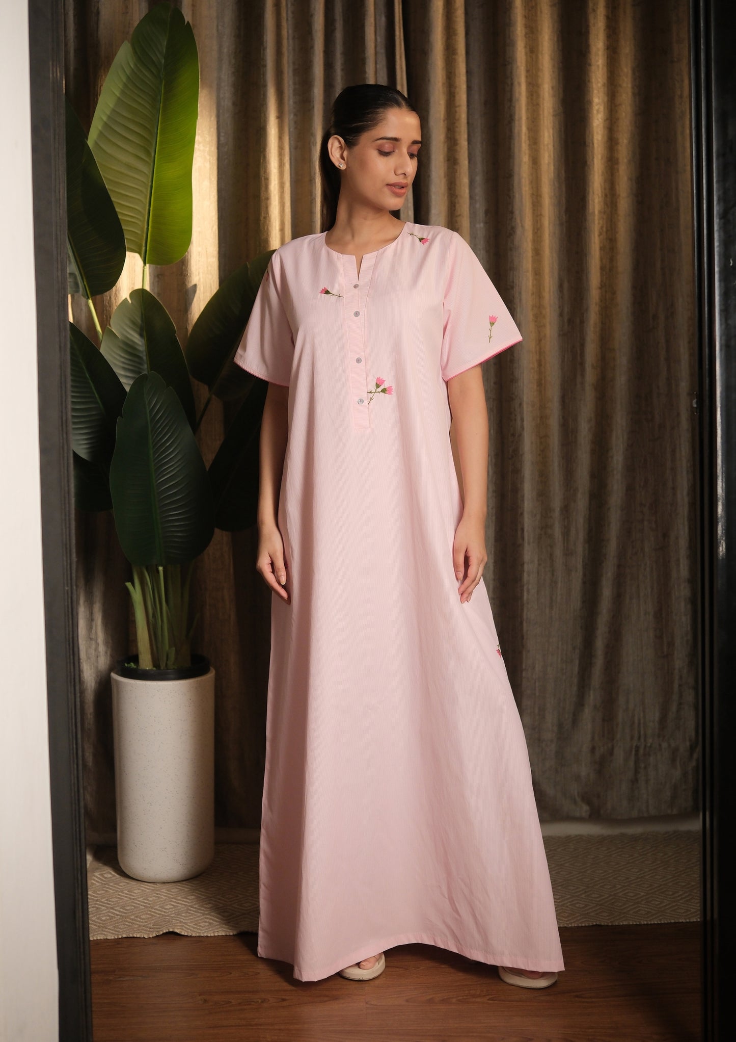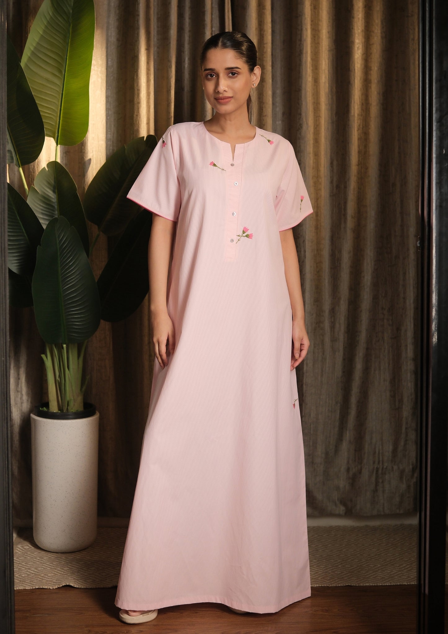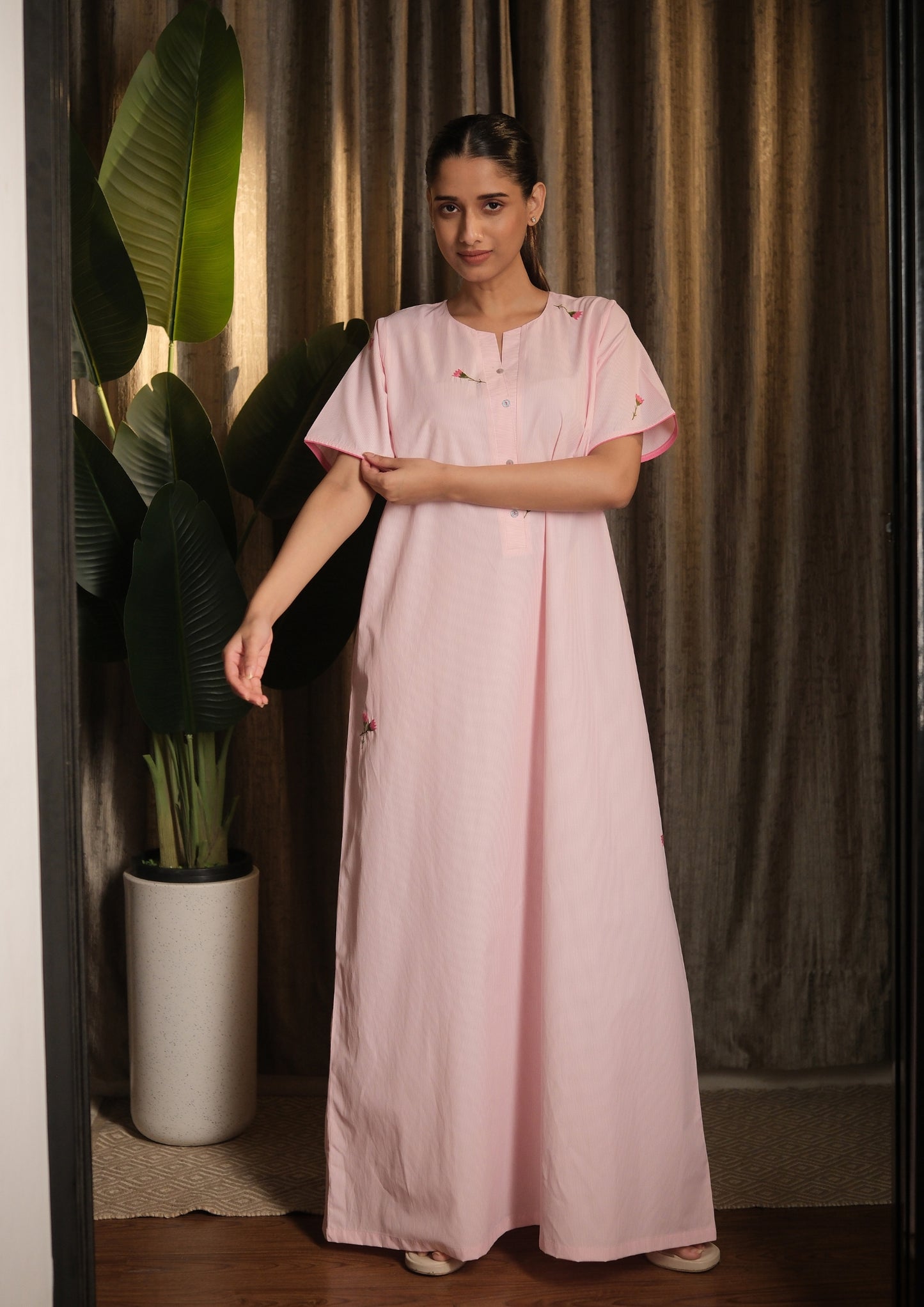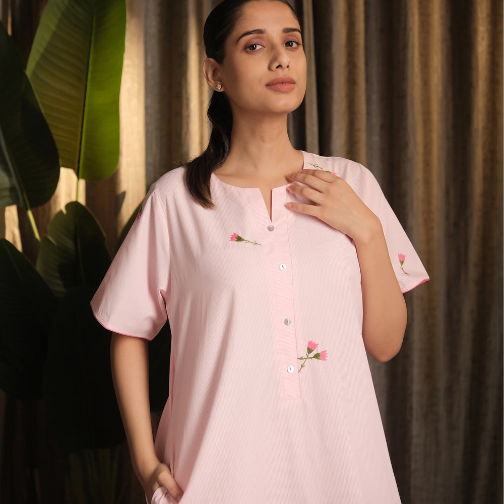 The Blush Petal Hand-Embroidered Nighty is where serenity meets sophistication. Crafted from soft striped cotton fabric, it offers a gentle texture that feels like a dream against your skin. The soothing blush pink hue is adorned with delicate hand-embroidered floral motifs, adding a touch of artisanal grace to your everyday nightwear.