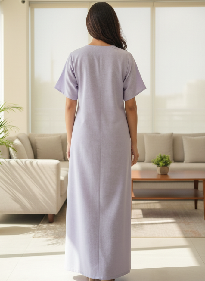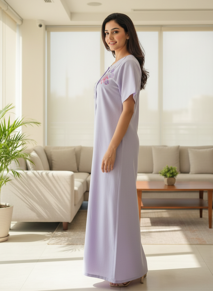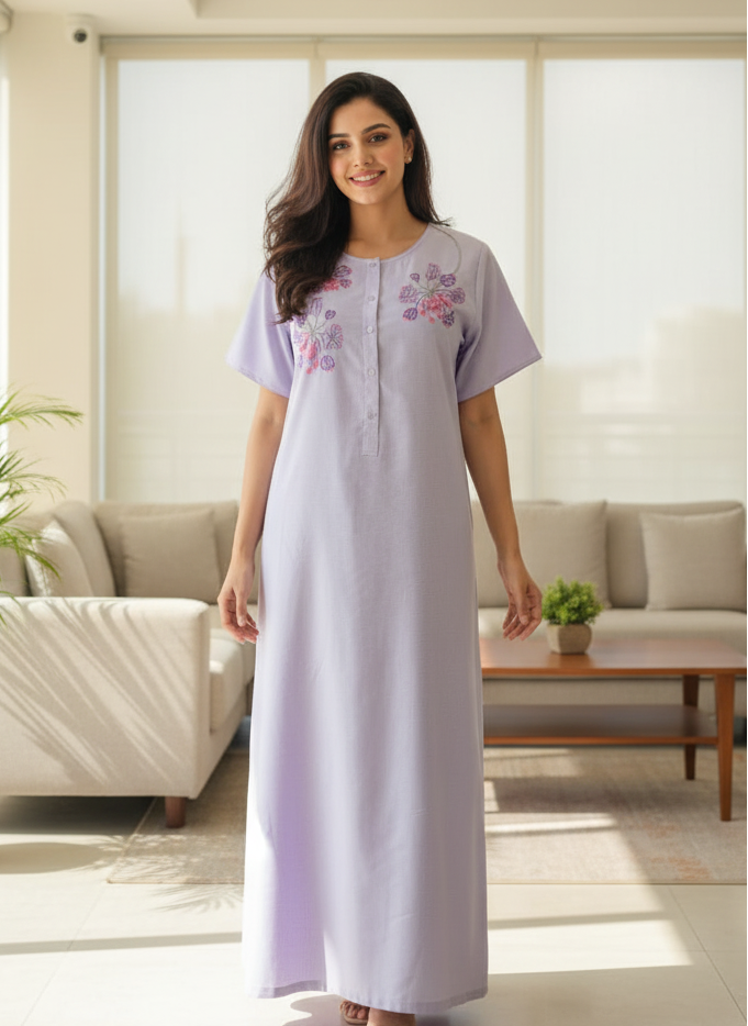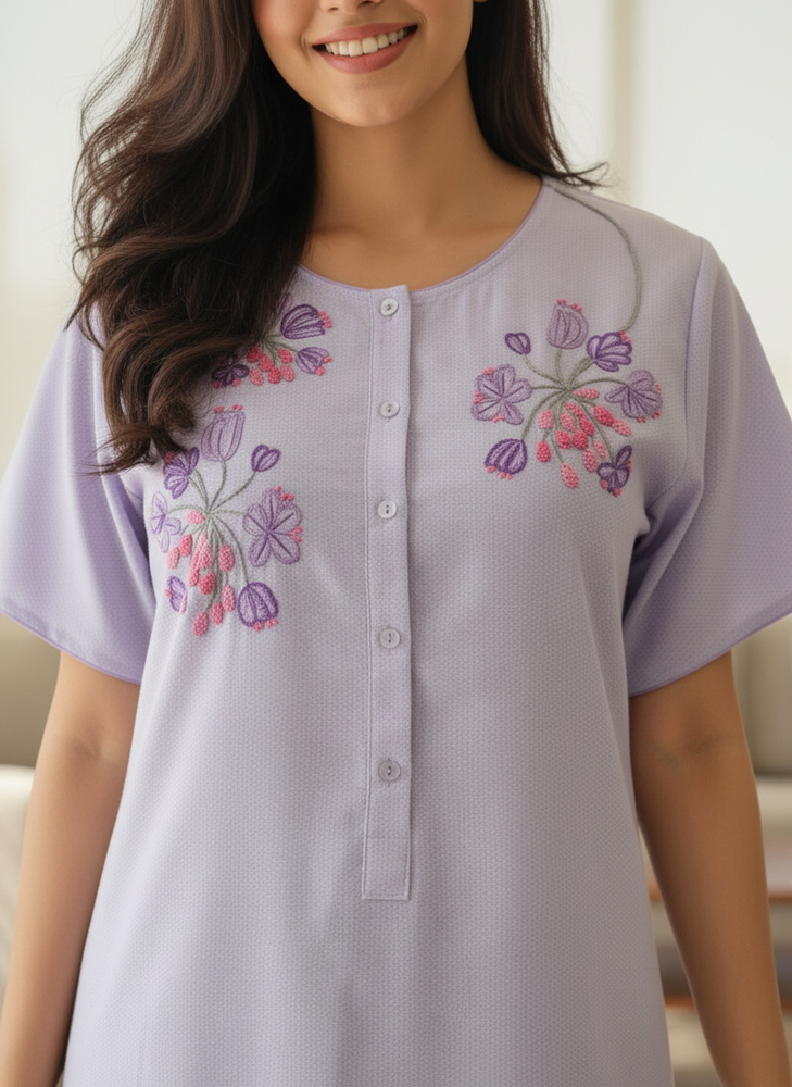 The Lilac Bloom Hand-Embroidered Nighty is crafted in a soft pastel lilac shade and adorned with delicate floral embroidery on the chest — each motif skillfully hand-embroidered by our artisans. The silhouette is relaxed and flowy, ensuring all-night comfort and effortless elegance whether you’re lounging, reading, or unwinding after a long day.