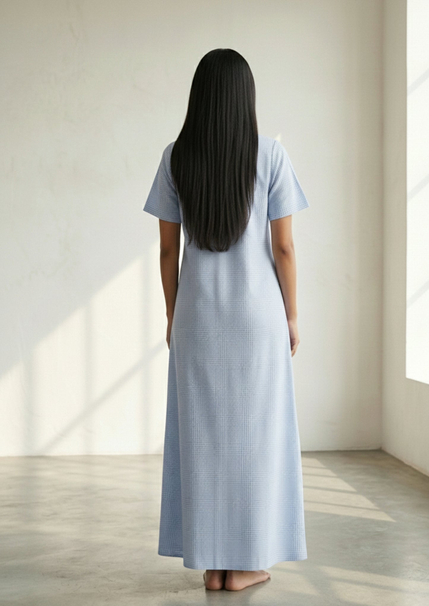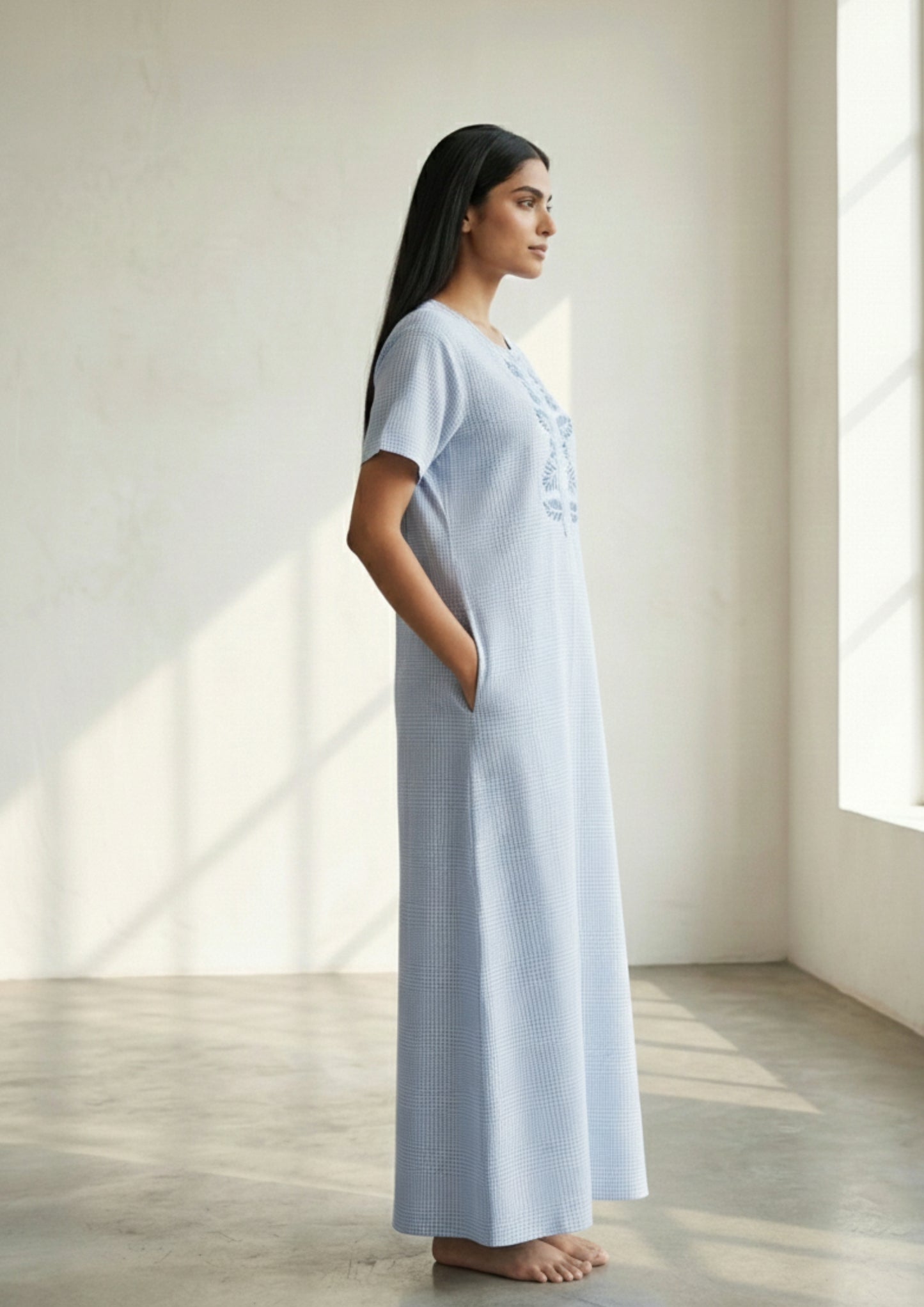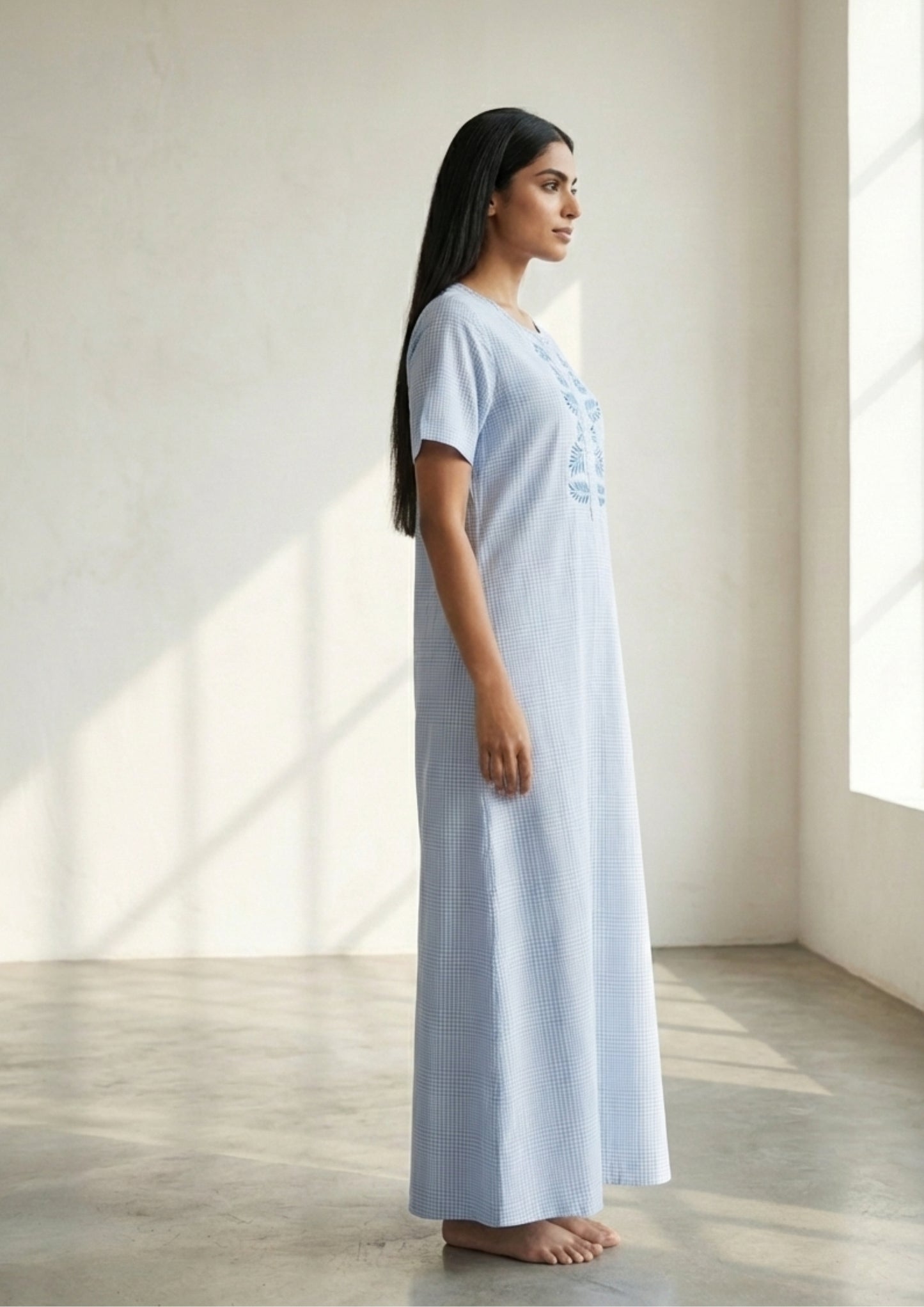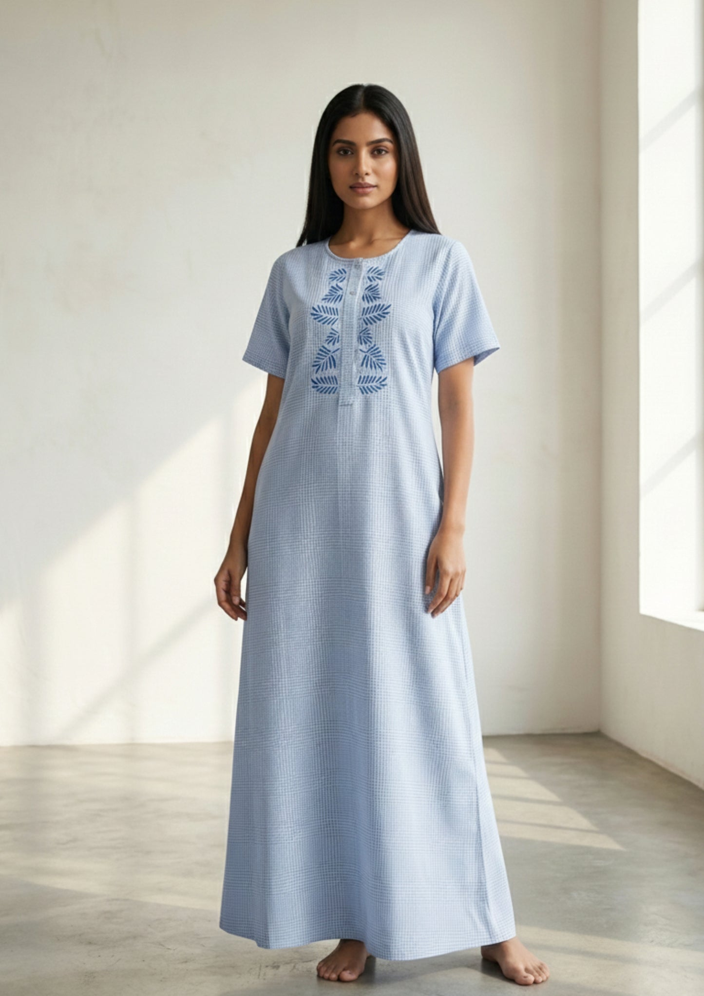 The minimal embroidered detailing adds a touch of handcrafted charm, while the flowing full-length design ensures ease of movement and cozy coverage. Thoughtfully made for women who value comfort with grace, this nighty is perfect for restful sleep and relaxed days at home.