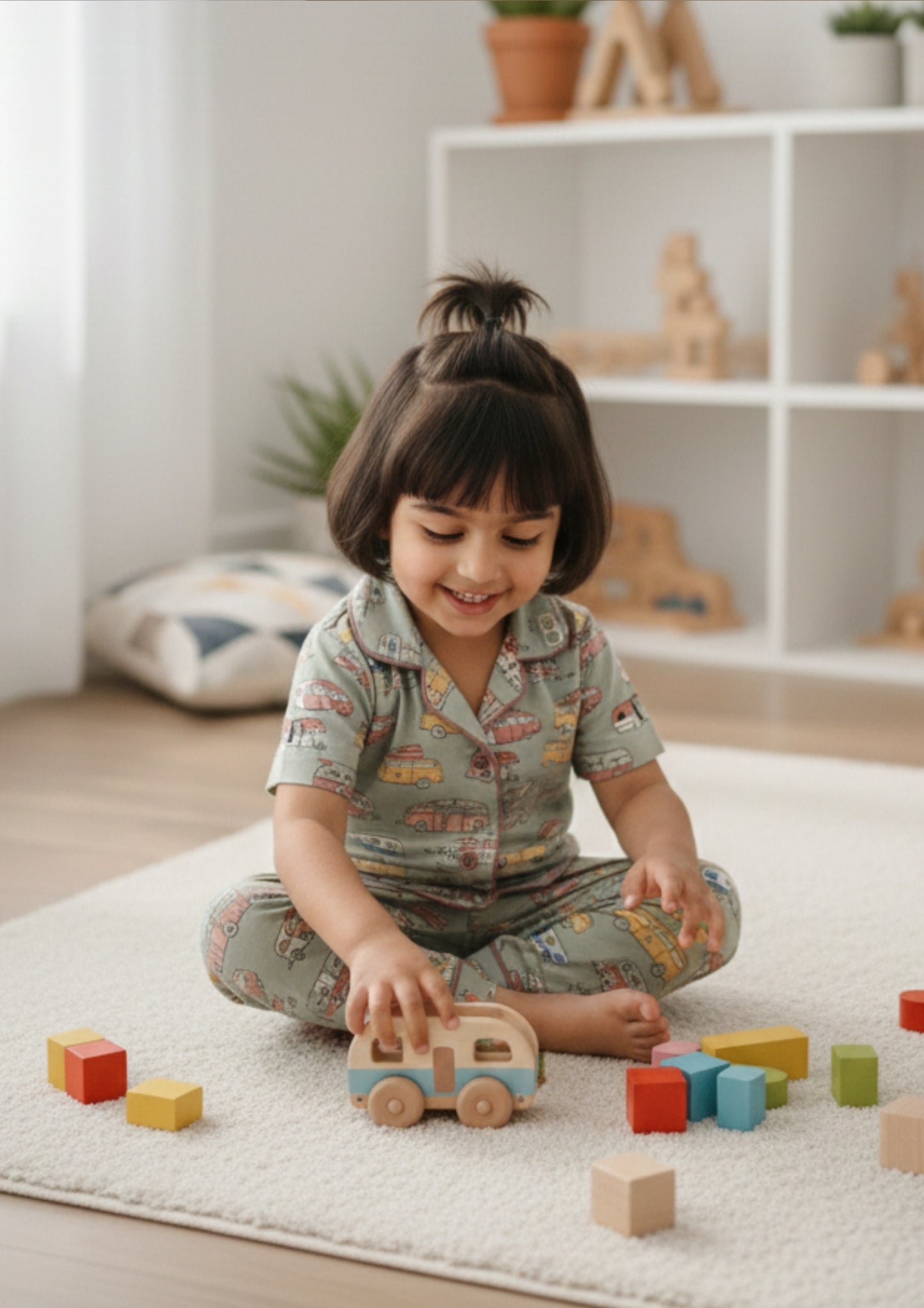 Regular price ₹ 664.00The Retro Ride Kids Set brings vintage road-trip charm to bedtime with its all-over vehicle print set against a soft muted base. Designed in a timeless two-piece silhouette, it features a short-sleeve, collared button-down top accented with subtle contrast piping, paired with matching full-length pants for a coordinated finish. The relaxed fit ensures easy movement from playtime to wind-down moments, while the colorful vans and cars add personality without overwhelming the look. Perfect for both boys and girls, this unisex kids night suit blends everyday comfort with a polished, classic appeal.