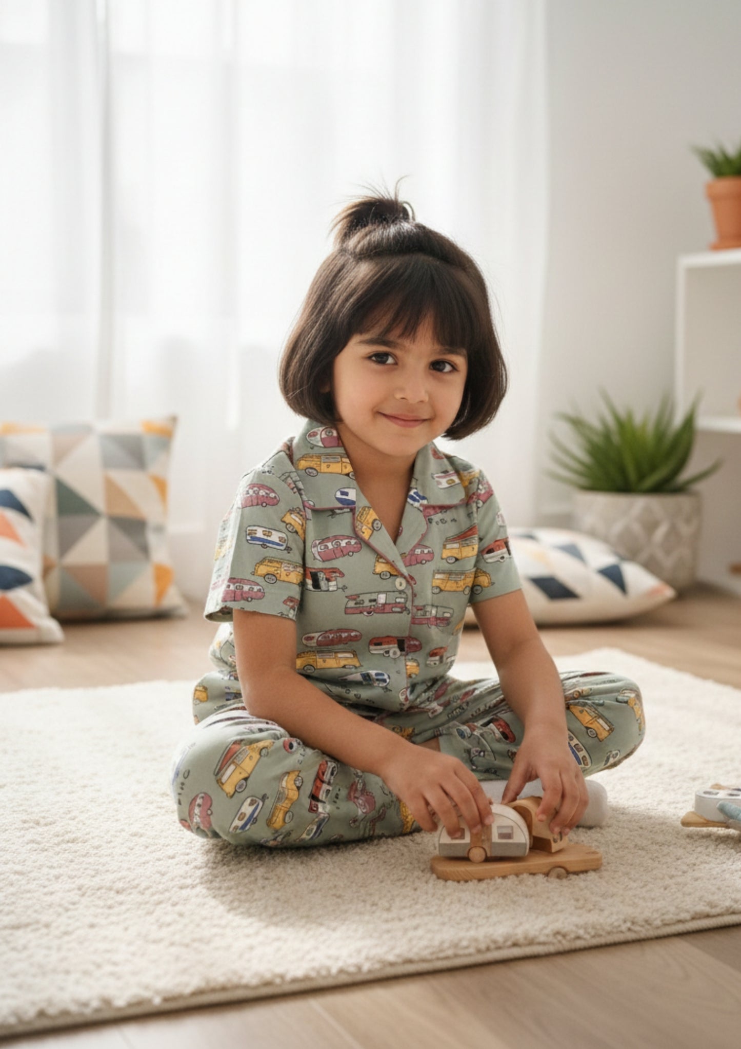 The Retro Ride Kids Set brings vintage road-trip charm to bedtime with its all-over vehicle print set against a soft muted base. Designed in a timeless two-piece silhouette, it features a short-sleeve, collared button-down top accented with subtle contrast piping, paired with matching full-length pants for a coordinated finish. The relaxed fit ensures easy movement from playtime to wind-down moments, while the colorful vans and cars add personality without overwhelming the look. Perfect for both boys and girls, this unisex kids night suit blends everyday comfort with a polished, classic appeal.