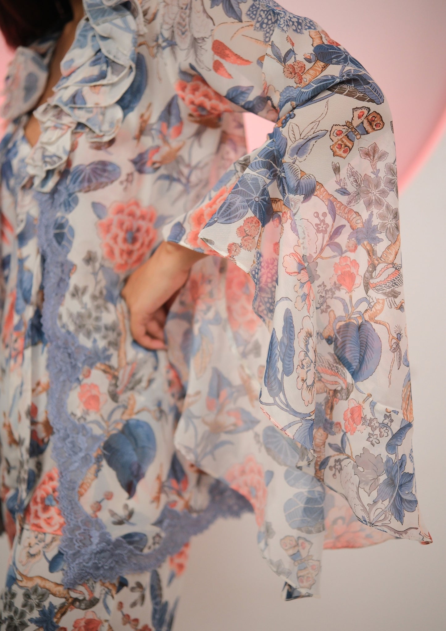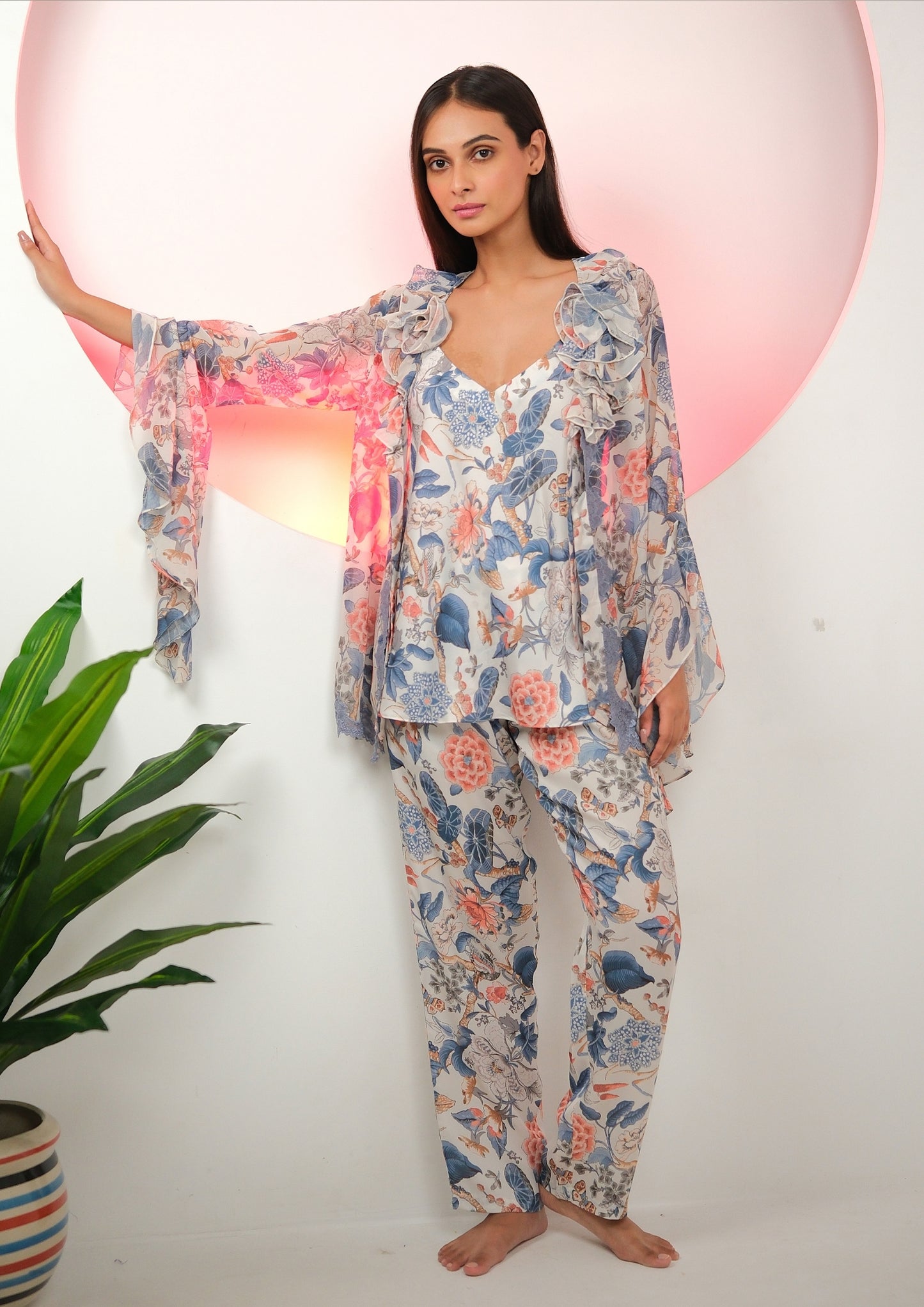 Featuring a delicate floral print, a flattering inner top, easy-fit pants, and a romantic sheer cape with ruffle detailing, this set brings together comfort and couture-inspired styling. Whether it’s slow mornings, festive evenings at home, or your bridal trousseau wardrobe, this piece is designed to make you feel effortlessly special.