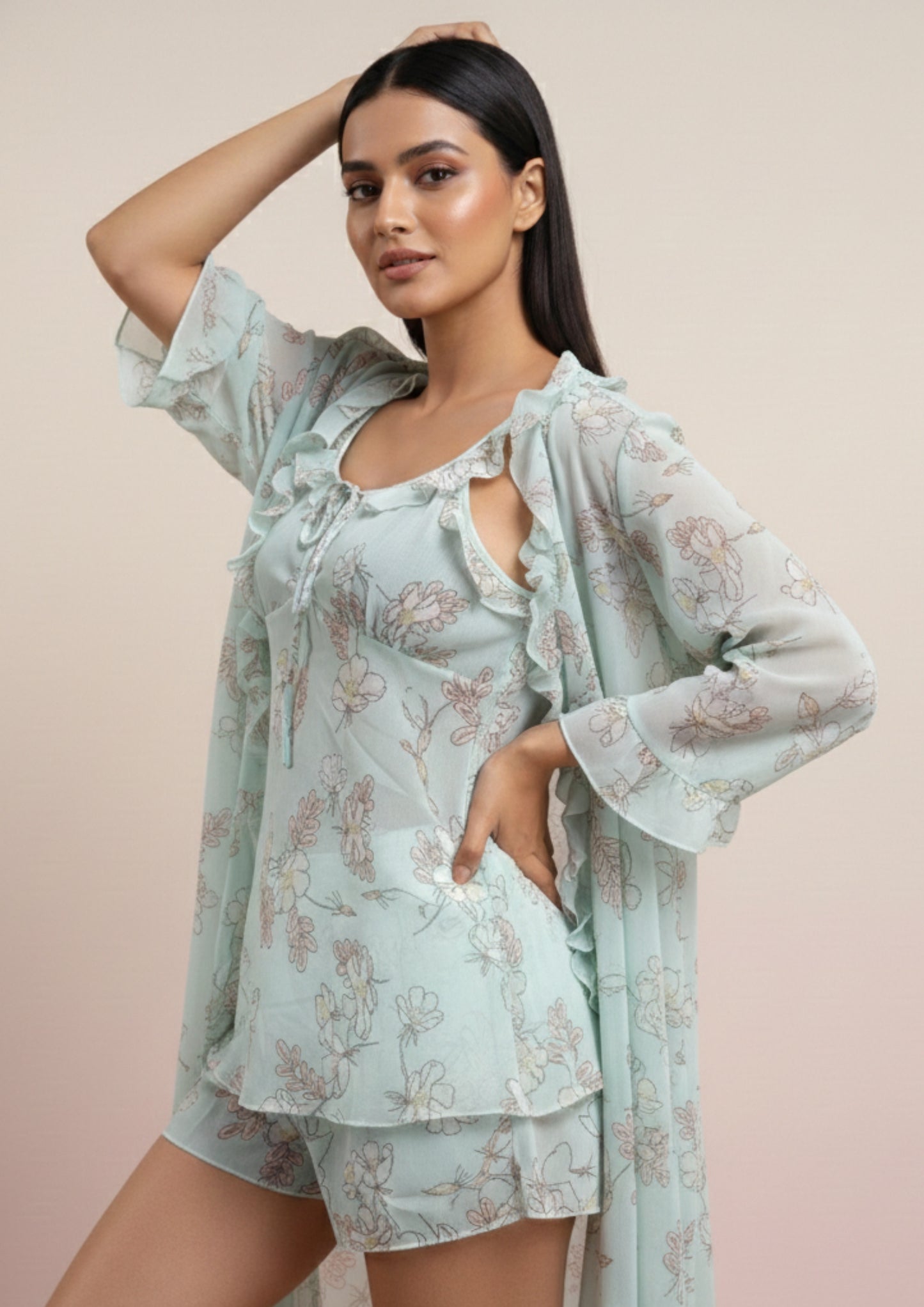 The Sage Bloom Bridal Lounge Set blends romantic charm with modern femininity. The camisole features a softly gathered silhouette with ruffle detailing along the neckline and a delicate front tie that adds subtle allure. Paired with relaxed shorts for effortless comfort, the set creates a flattering and playful shape. The matching long robe, crafted in the same floral print with fluid drape and soft movement, completes the three-piece ensemble with refined elegance. Perfect for bridal trousseau or honeymoon moments, this set captures lightness, grace, and understated sensuality in every detail.