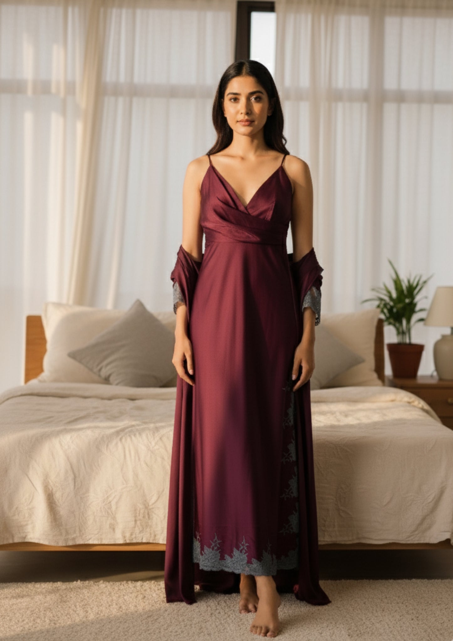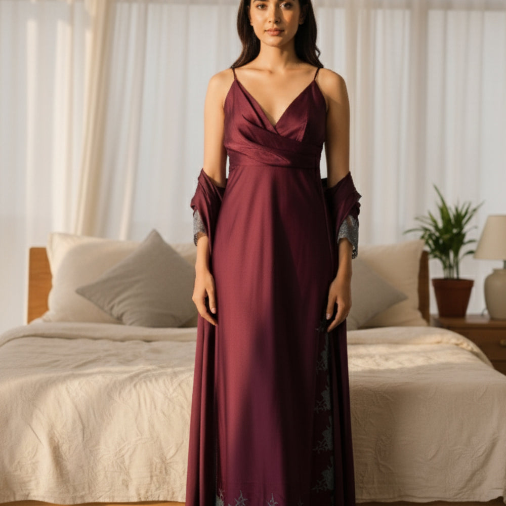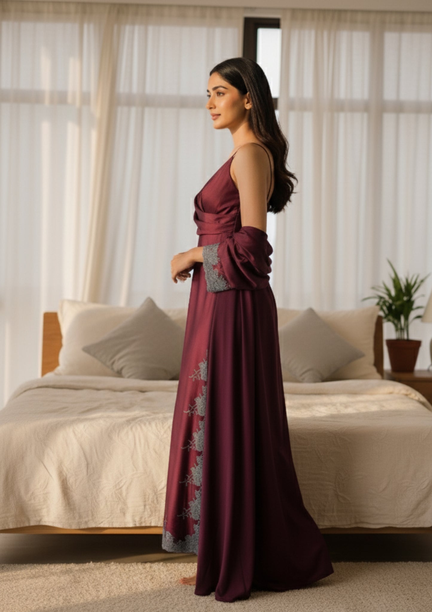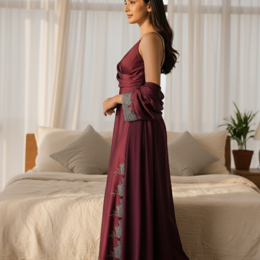 Slip into something unforgettable with this luxurious bridal gown set, designed to wrap you in elegance on your most special nights. The Italian silk satin caresses the skin, while intricate lace details and graceful tailoring create a look that’s both timeless and tender.