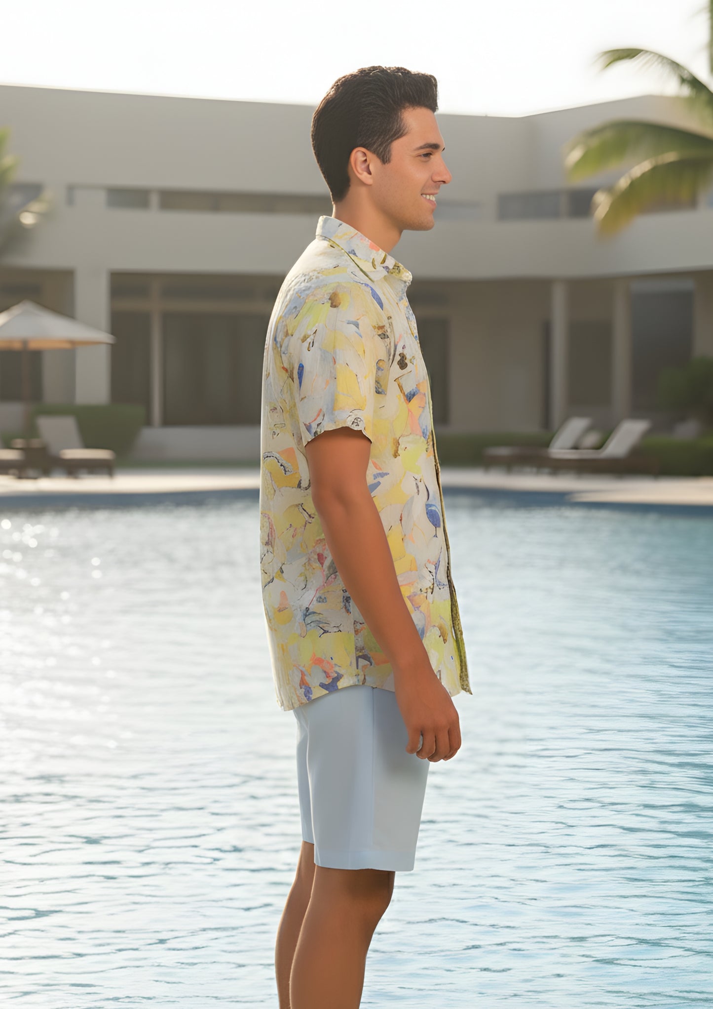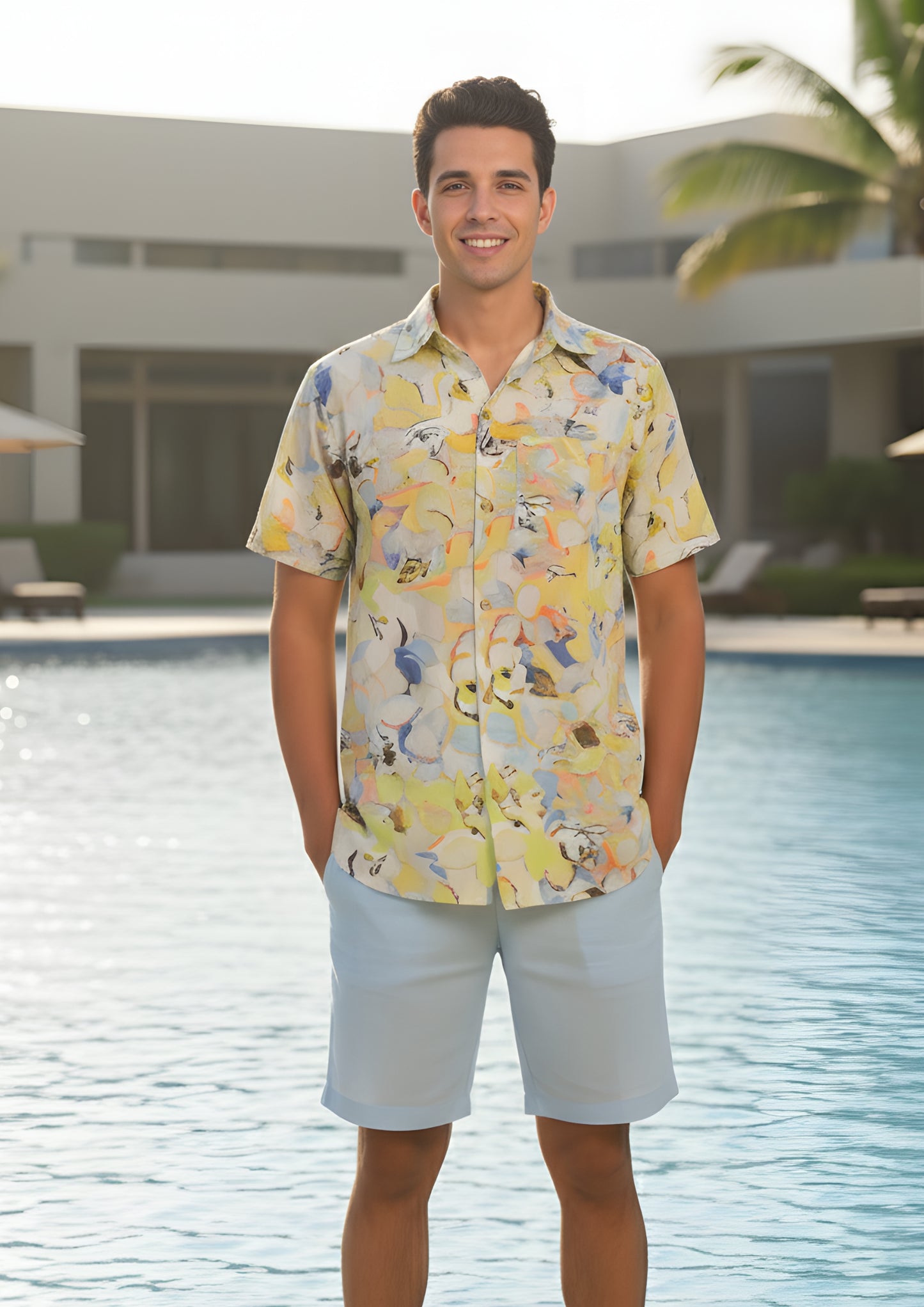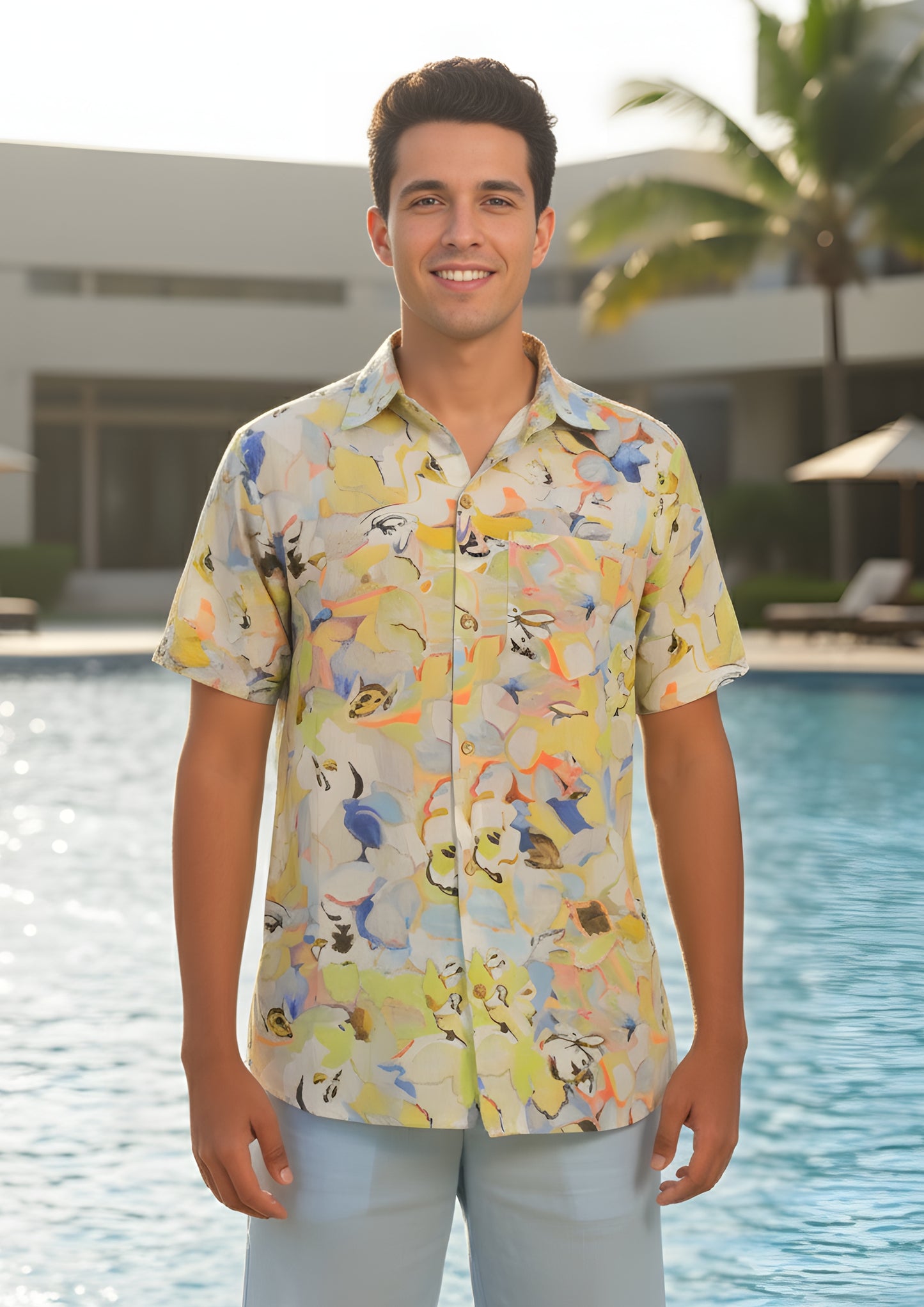 This beachwear printed shirt for men is where art meets leisure. Drenched in abstract tropical hues, it's designed to channel vacation ease with a tailored edge. Whether you're strolling barefoot on the beach or grabbing sundowners by the pool, this shirt keeps you stylish, cool, and camera-ready.