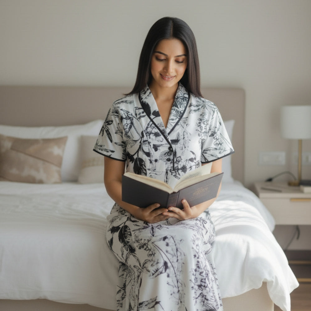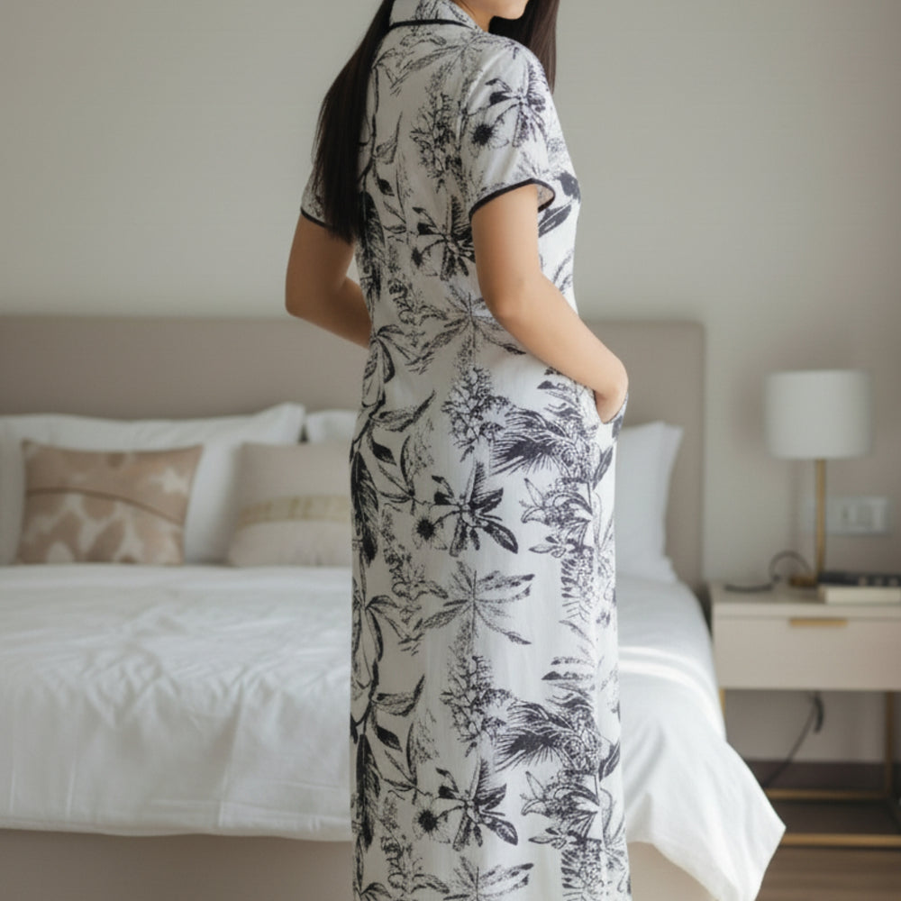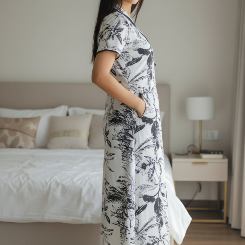 Unwind in effortless style with our Palm Whisper Printed Nighty, where tropical elegance meets pure comfort. Featuring a striking black botanical print on a soothing ivory base, this piece adds sophistication to your everyday lounging. The collared neckline and contrast piping create a polished silhouette, while the thoughtfully placed right-side pocket adds a touch of functionality.