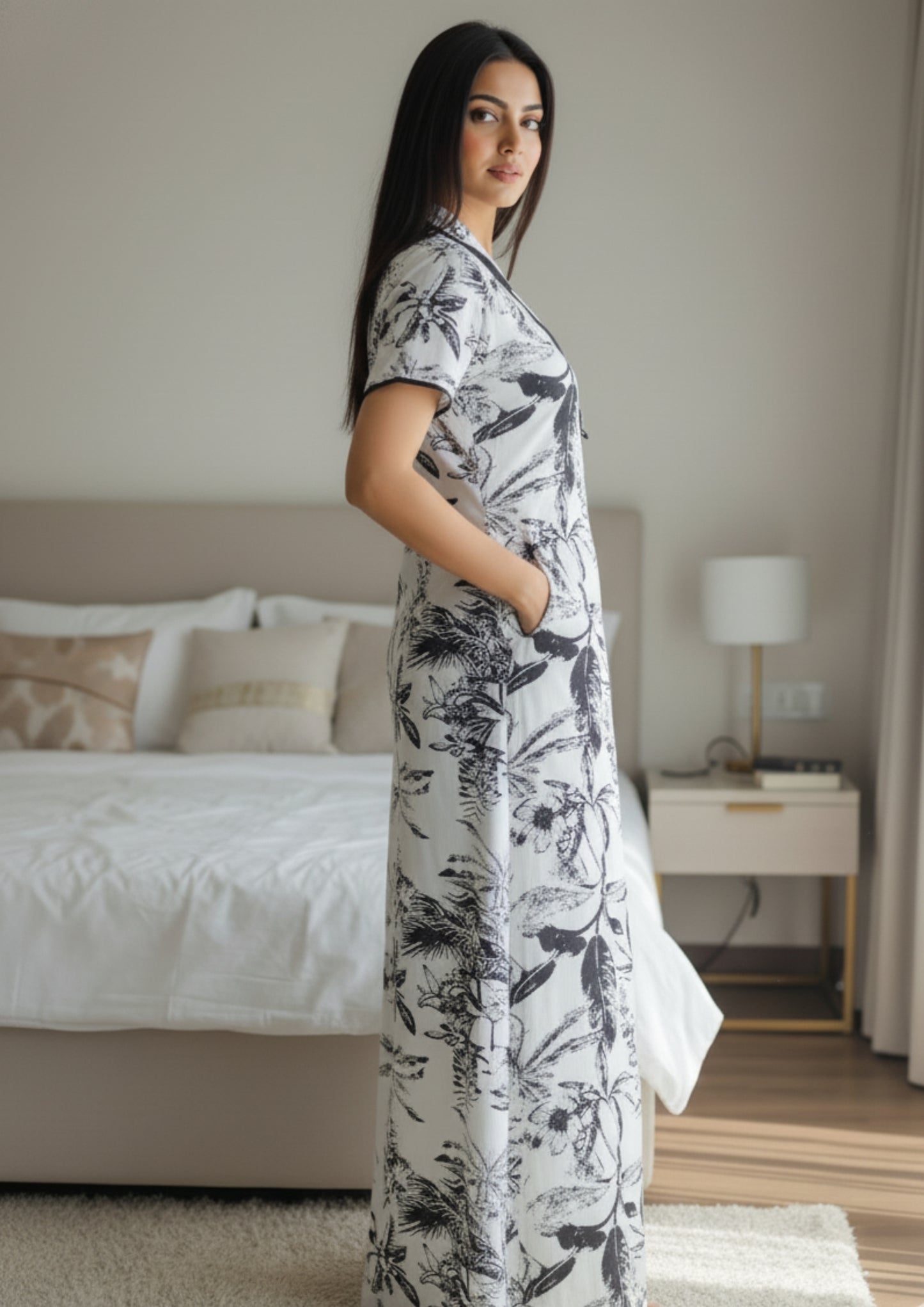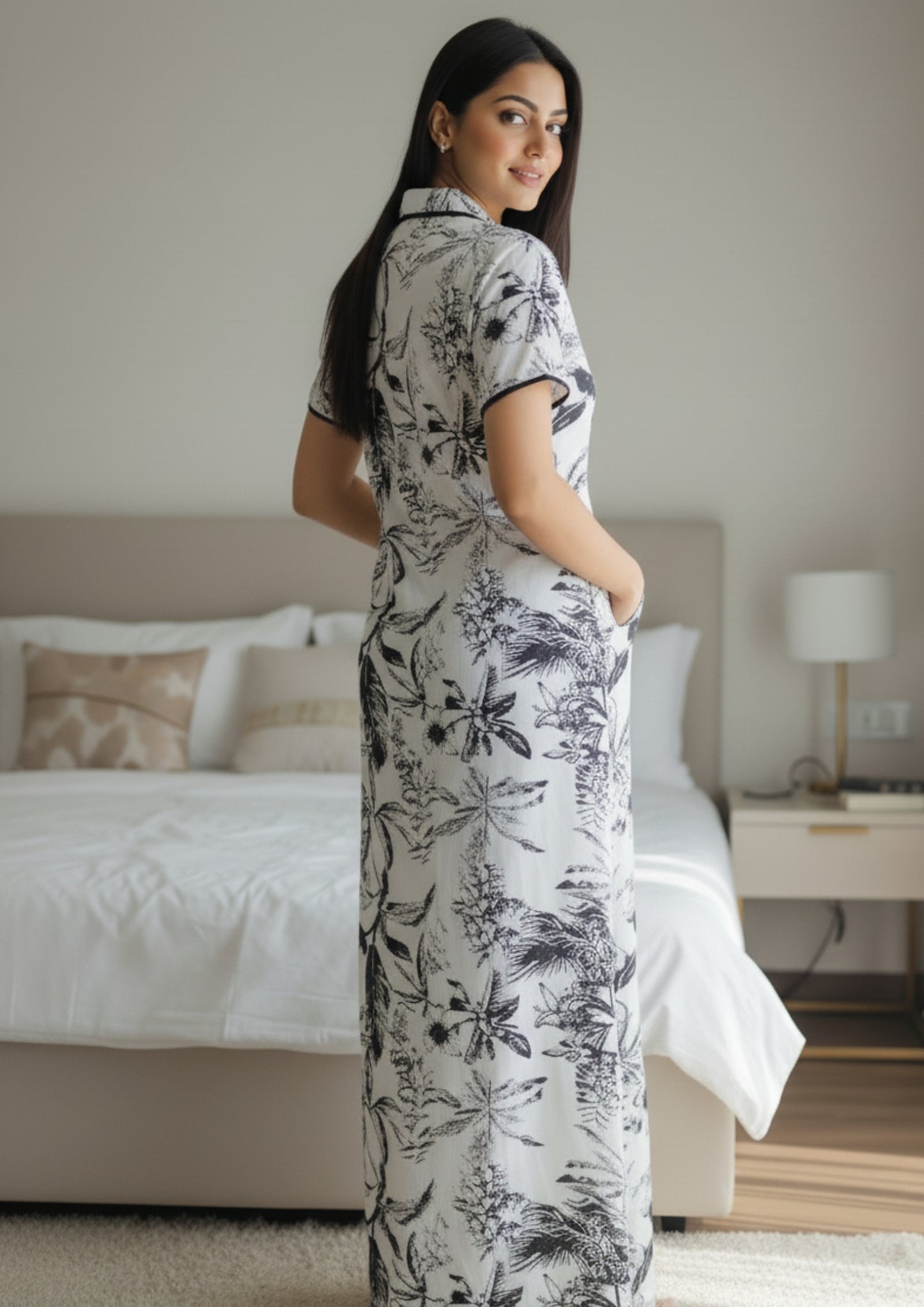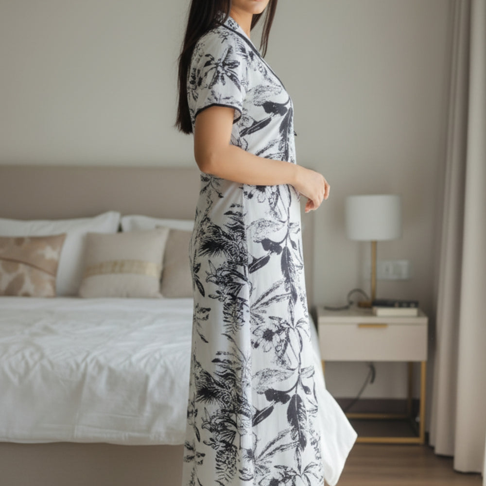 Unwind in effortless style with our Palm Whisper Printed Nighty, where tropical elegance meets pure comfort. Featuring a striking black botanical print on a soothing ivory base, this piece adds sophistication to your everyday lounging. The collared neckline and contrast piping create a polished silhouette, while the thoughtfully placed right-side pocket adds a touch of functionality.