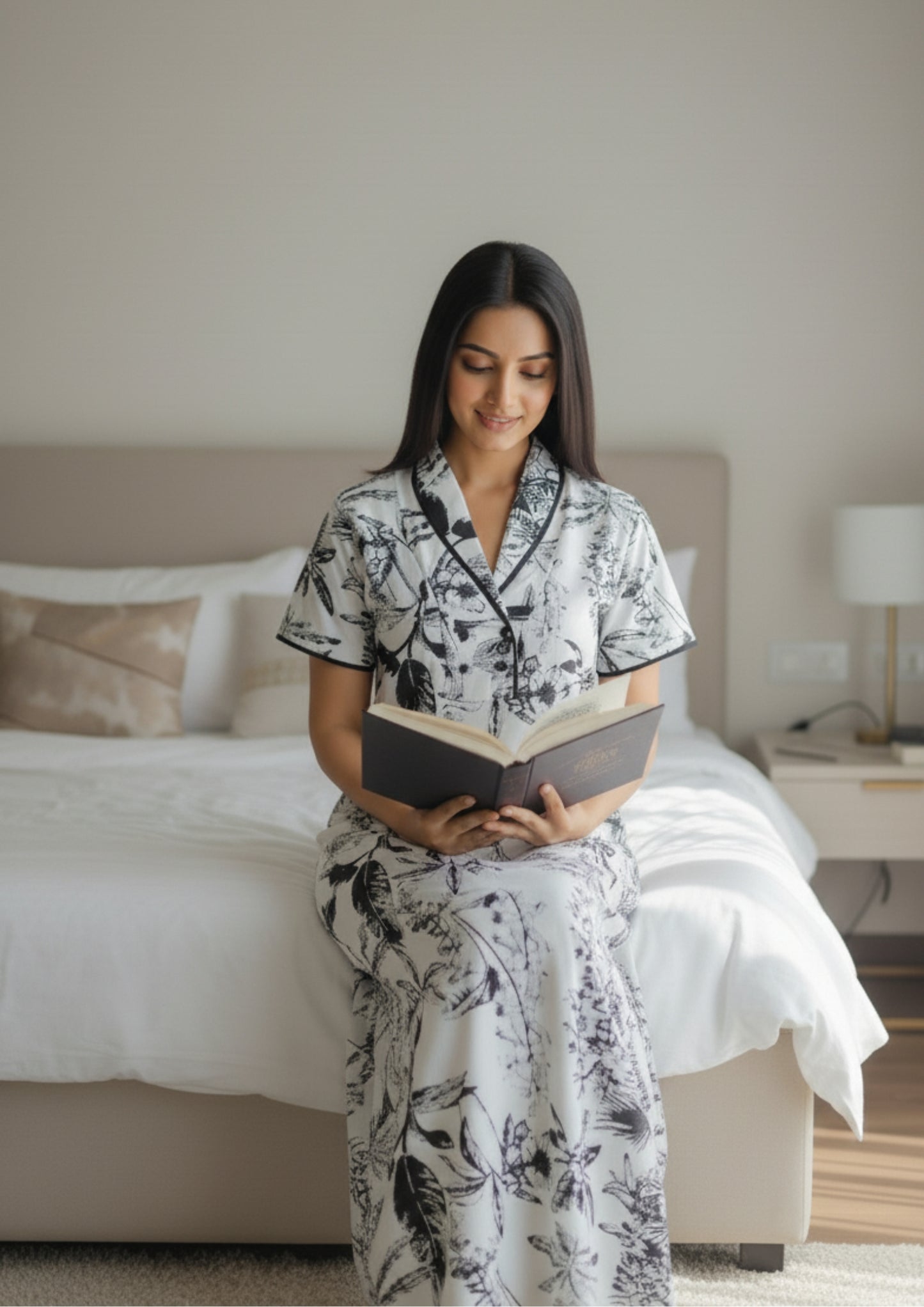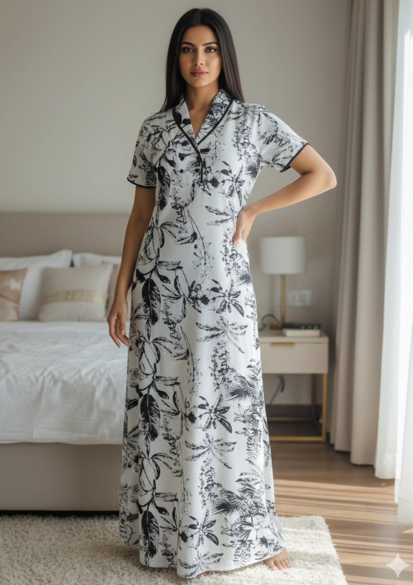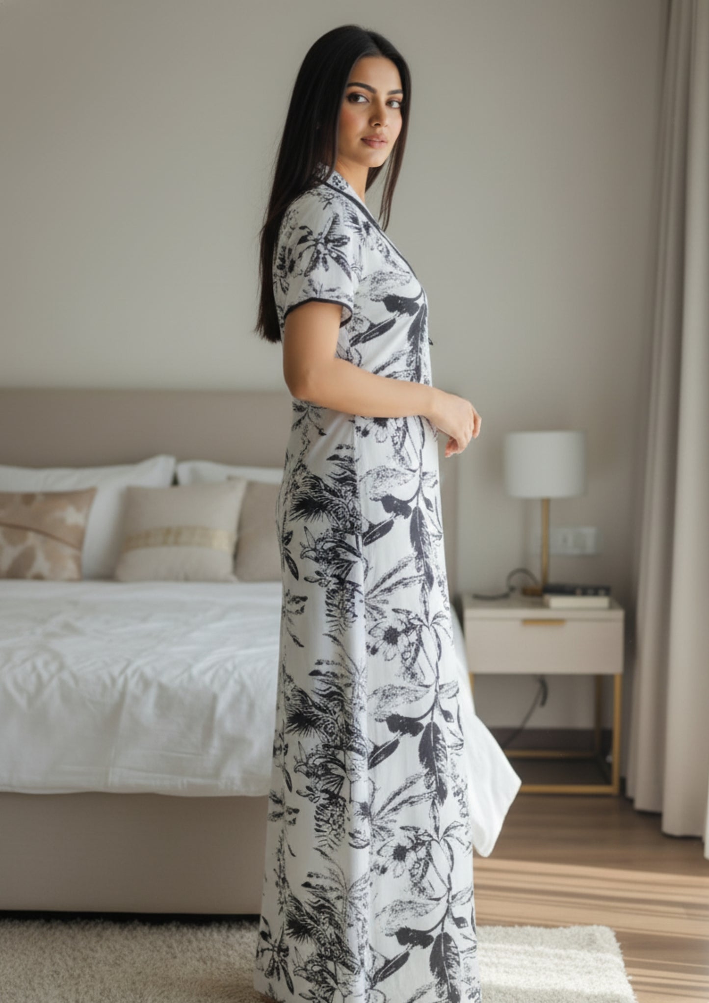 Crafted from breathable cotton, it’s perfect for warm evenings or cozy mornings — designed to make you feel serene and chic, even at home.