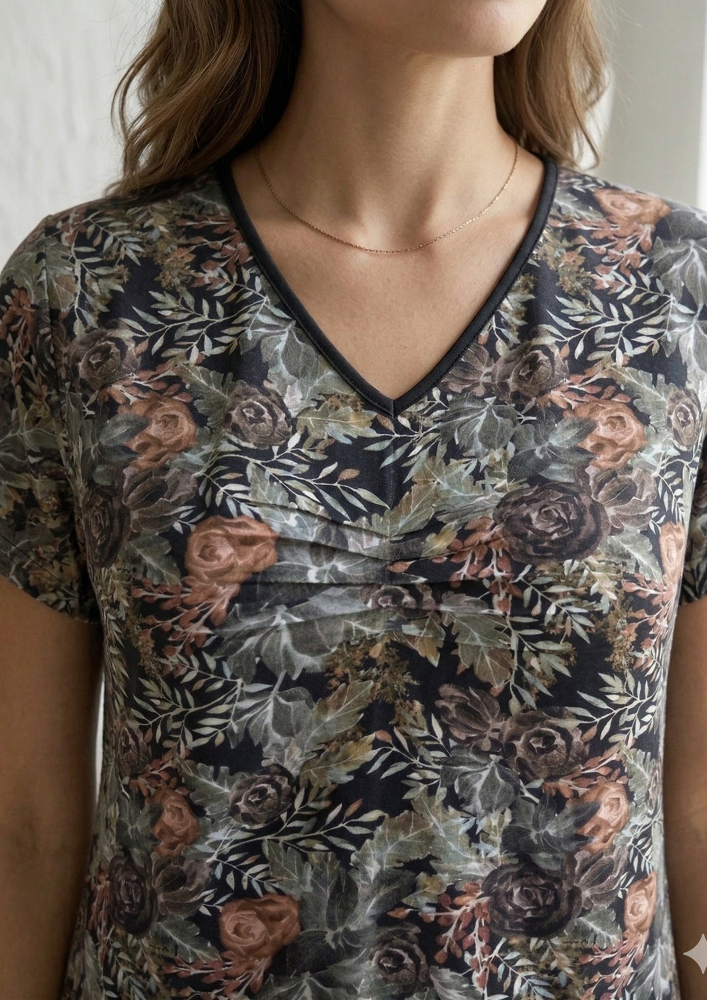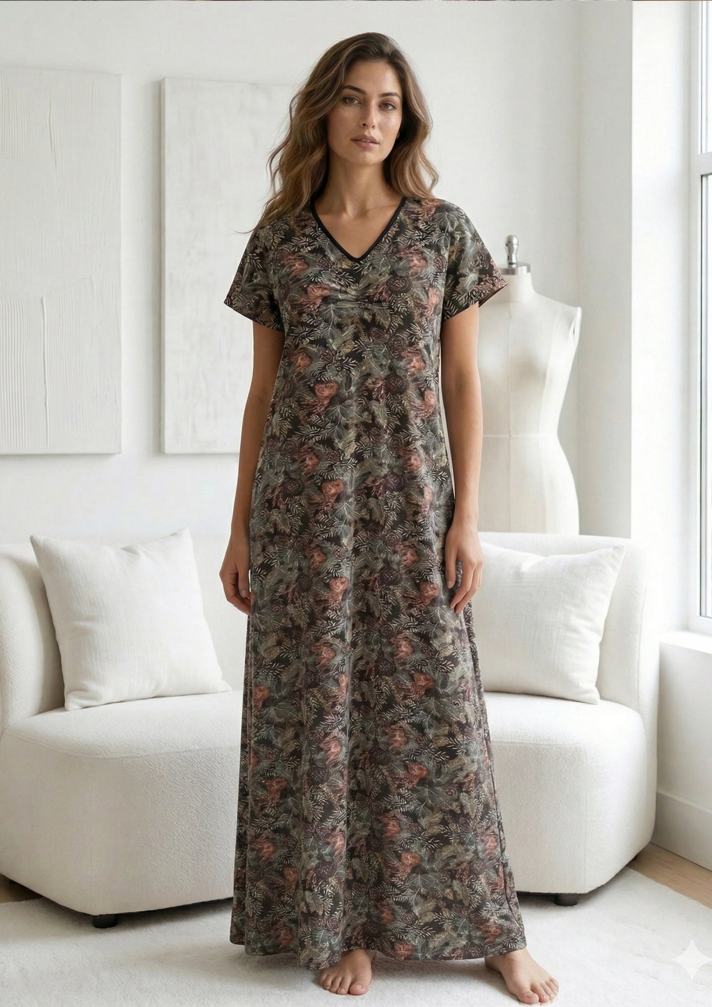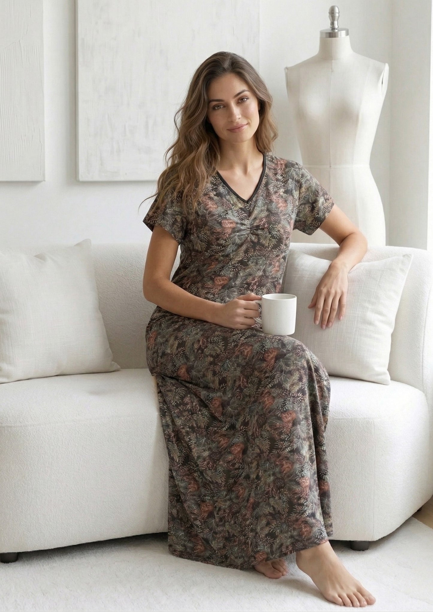 A refined printed nighty featuring earthy botanical motifs and soft ruffle sleeves for an elevated, feminine appeal.