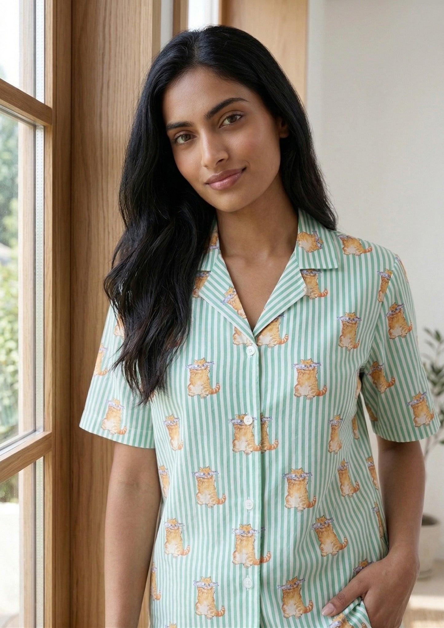 A cheerful night suit that brings personality to your downtime, featuring a charming printed motif set against soft vertical stripes. Designed with a classic button-down top and relaxed pants, it delivers an effortless blend of comfort and playful elegance for laid-back lounging.