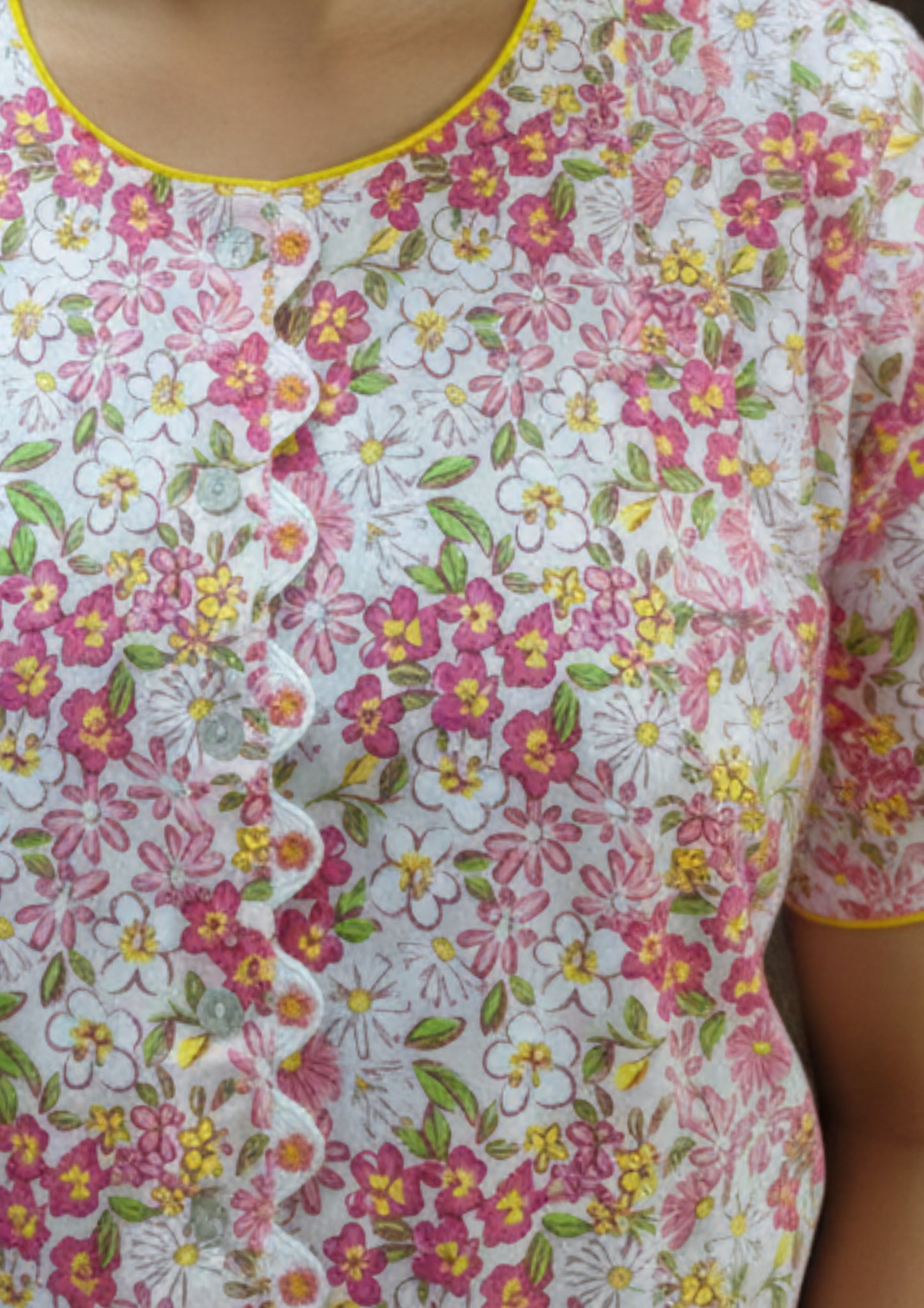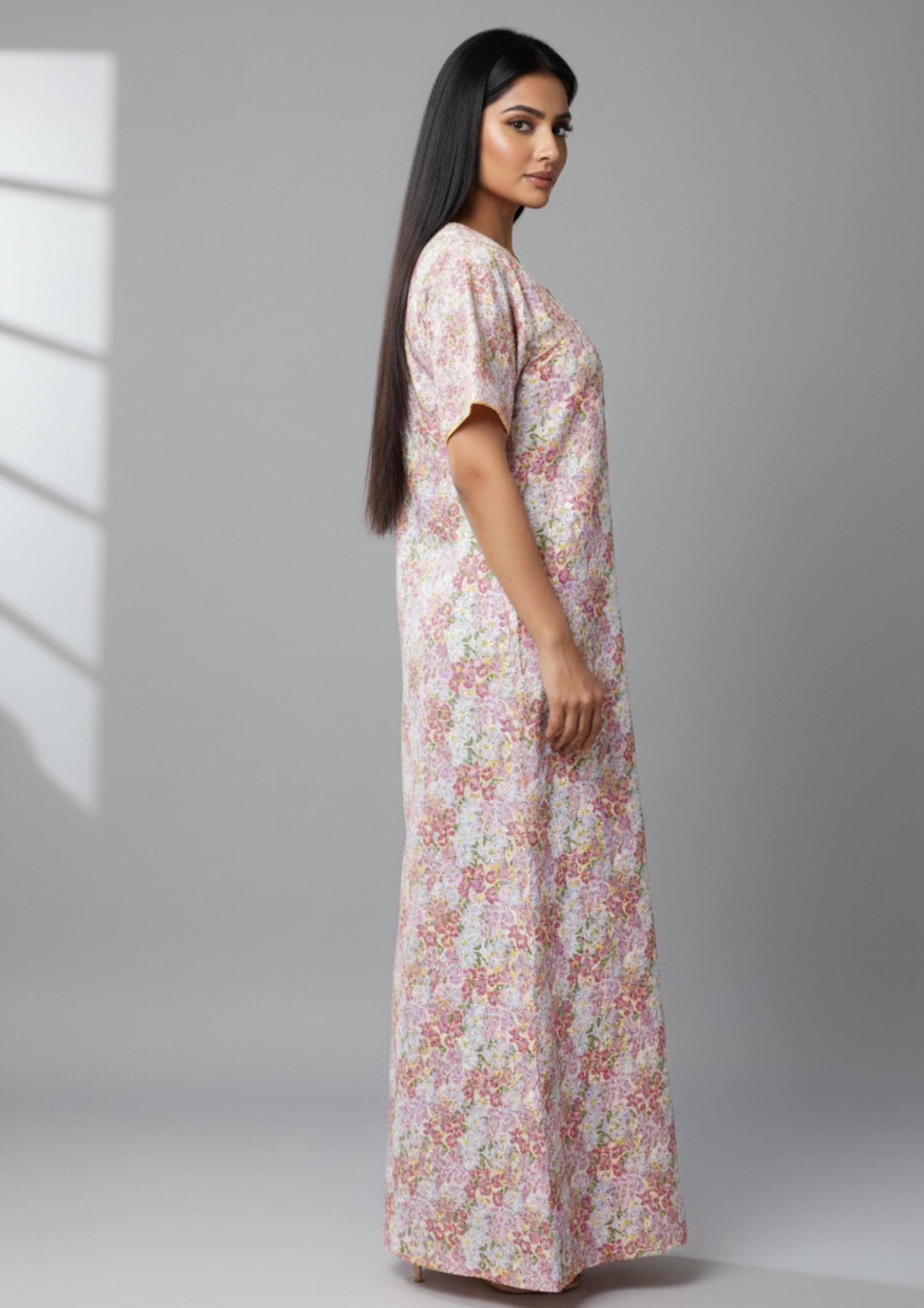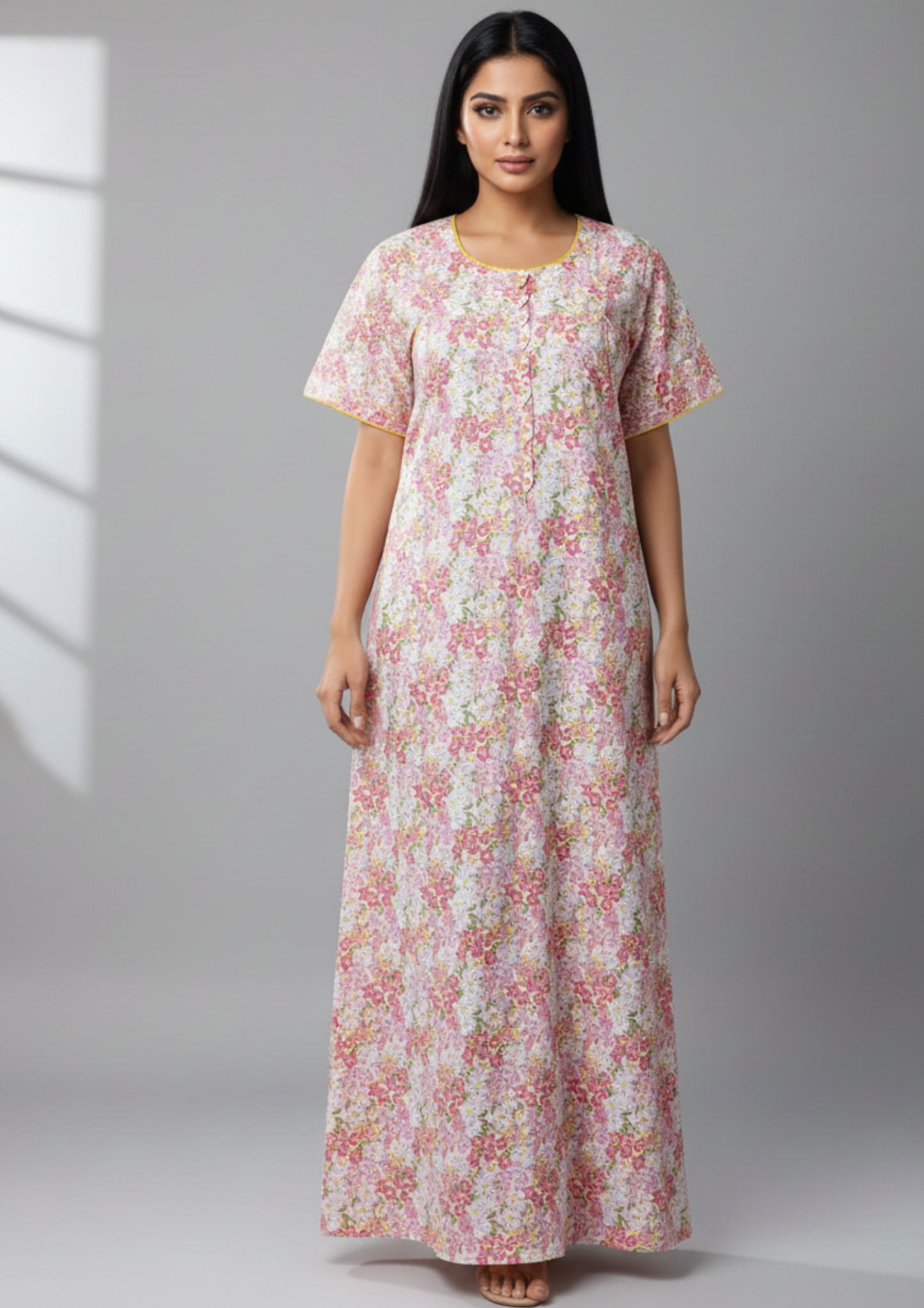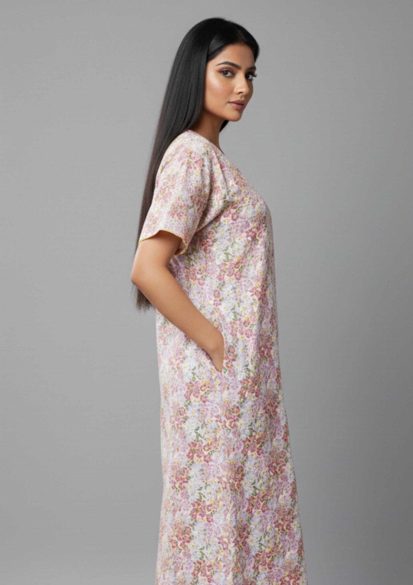 Add a touch of classic romance to your sleepwear wardrobe with the Vintage Petal Lace-Trimmed Nighty. Crafted in soft, breathable fabric, this nighty features a charming all-over floral print in pastel pinks and greens, evoking a sense of quiet elegance and comfort.