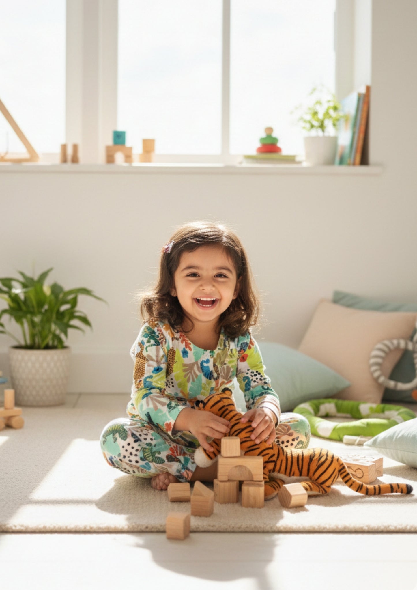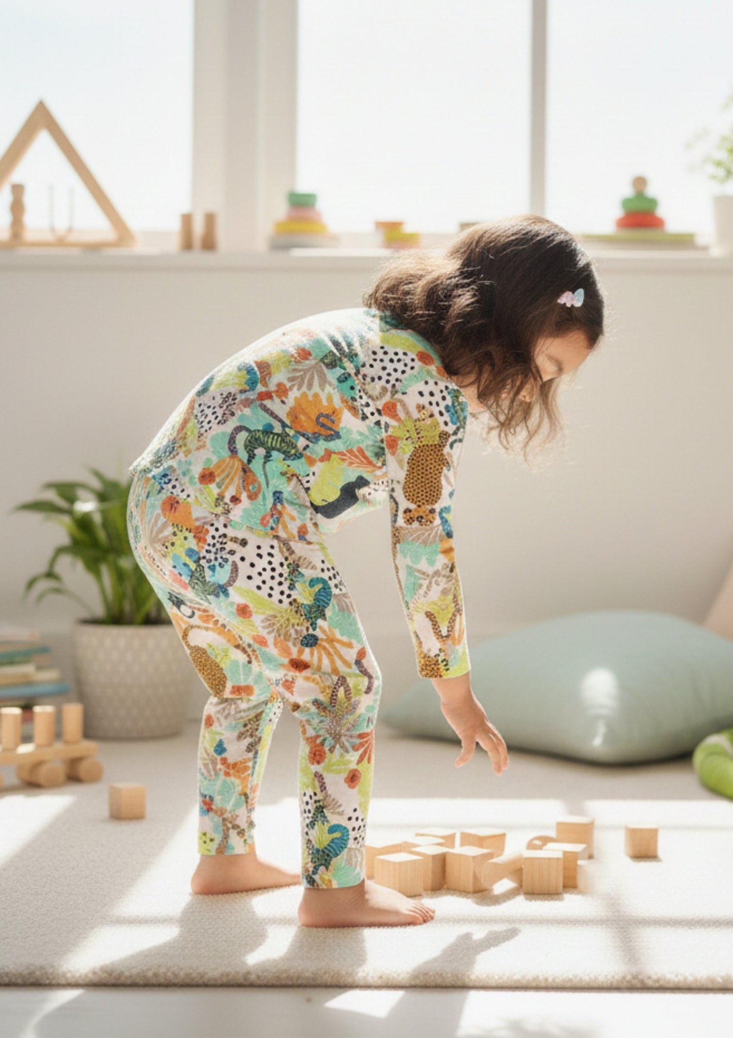 Regular price ₹ 697.00The Wild Canopy Kids Set brings the spirit of the jungle to bedtime with its lively animal and foliage print in fresh, cheerful tones. Designed in a comfortable two-piece silhouette, it features a round-neck, long-sleeve top paired with matching full-length pants for effortless coordination. The relaxed fit allows little ones to move freely from playtime to wind-down moments, while the vibrant print adds personality and charm. Perfect for both boys and girls, this unisex kids night suit blends comfort, color, and playful character for everyday lounging and restful nights.