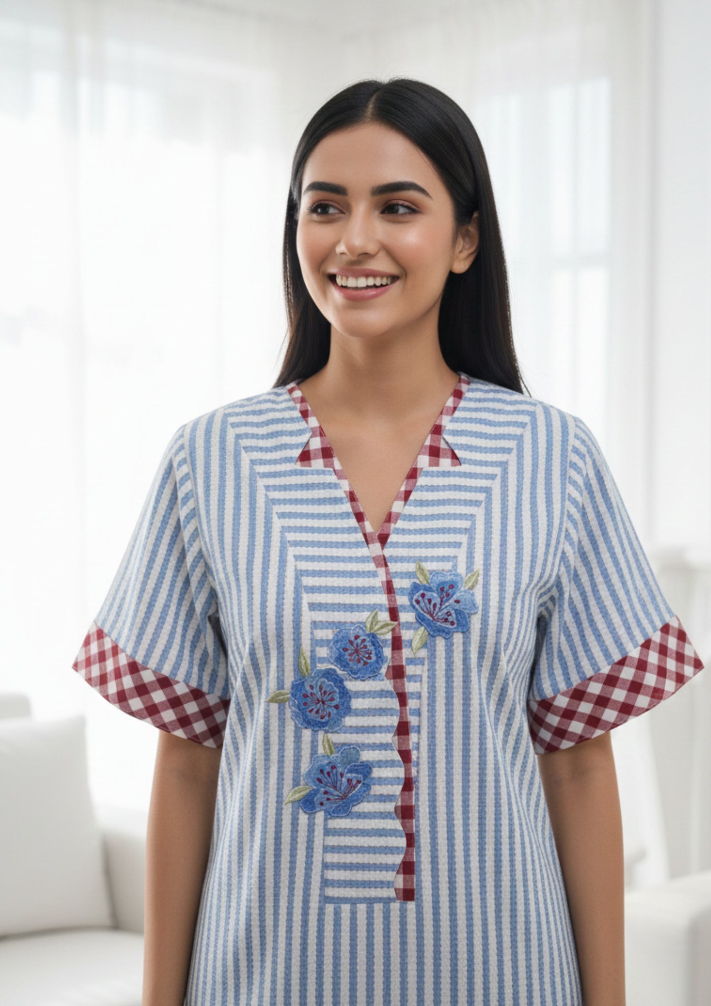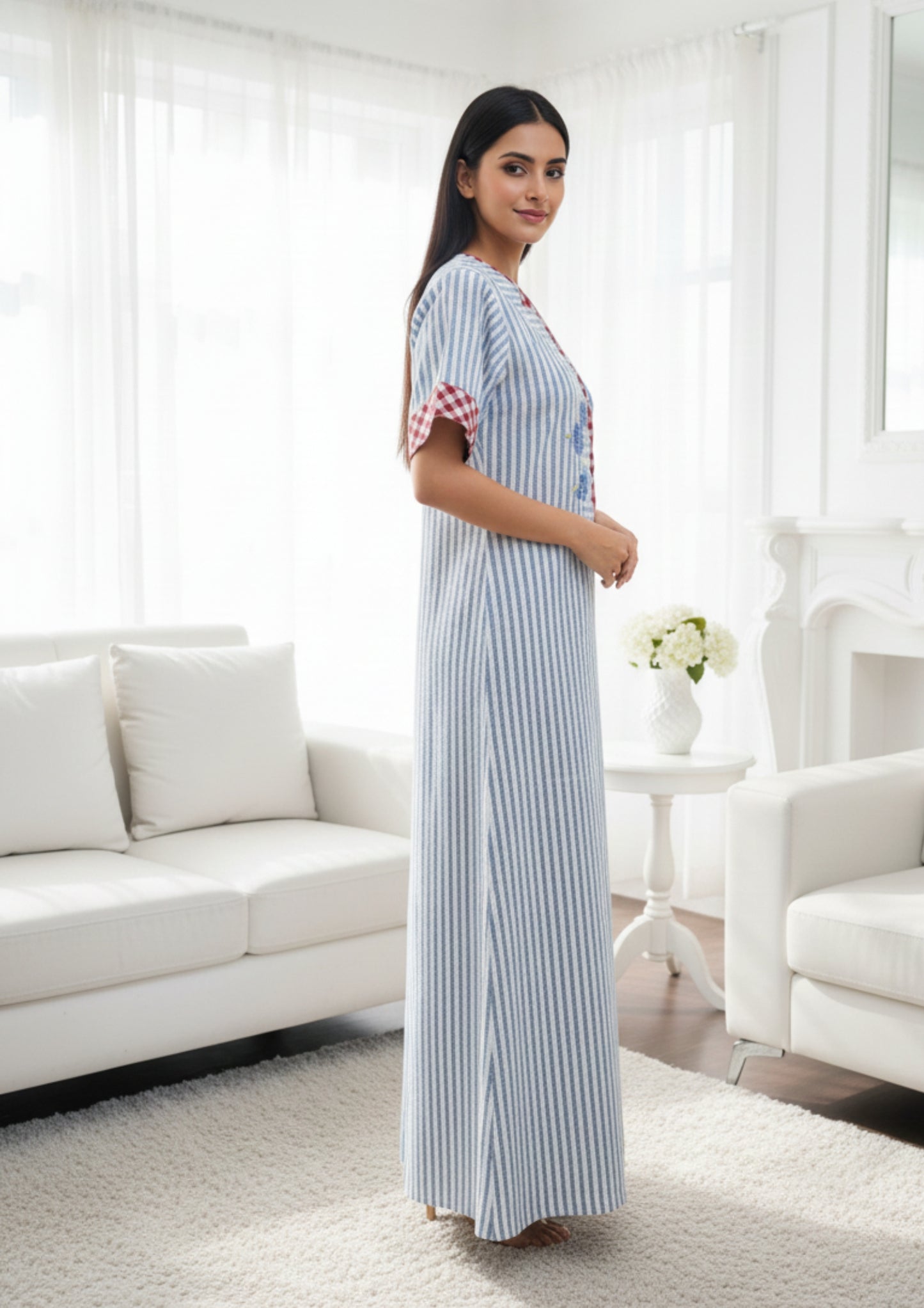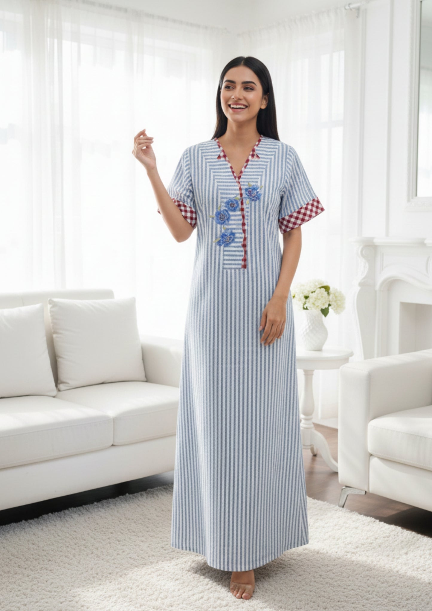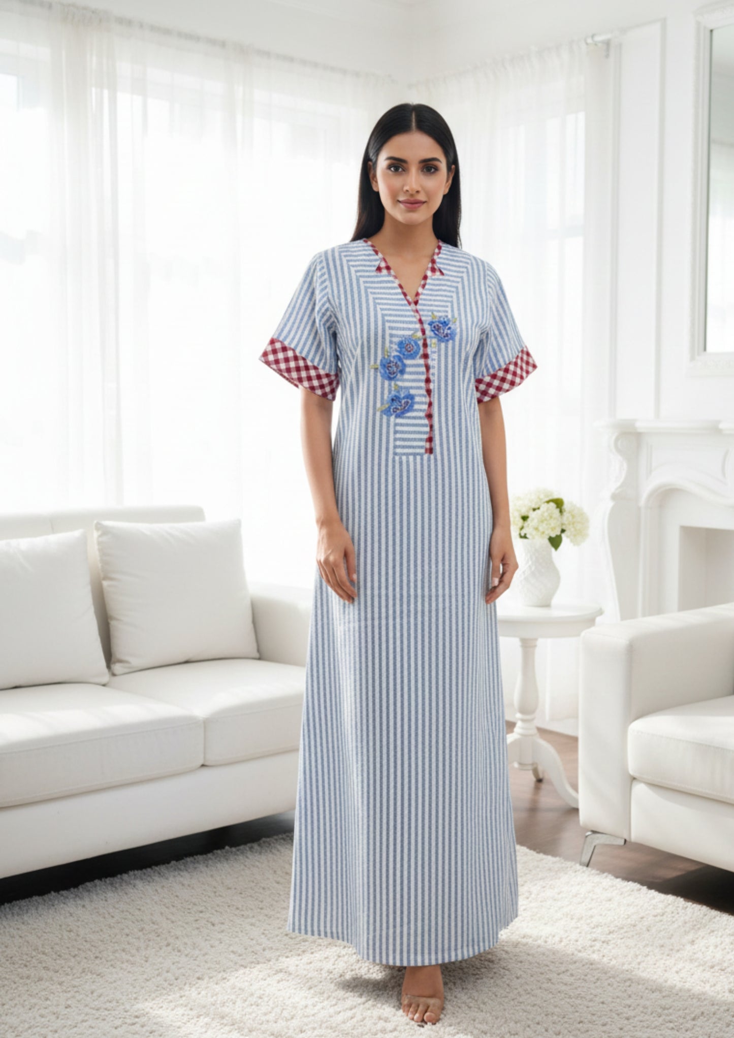 The Bluebell Stripe Hand-Embroidered Nighty blends everyday comfort with thoughtful design details. Crafted in soft cotton, this full-length nighty features timeless blue stripes paired with delicate hand embroidery that adds a refined, handcrafted feel.
