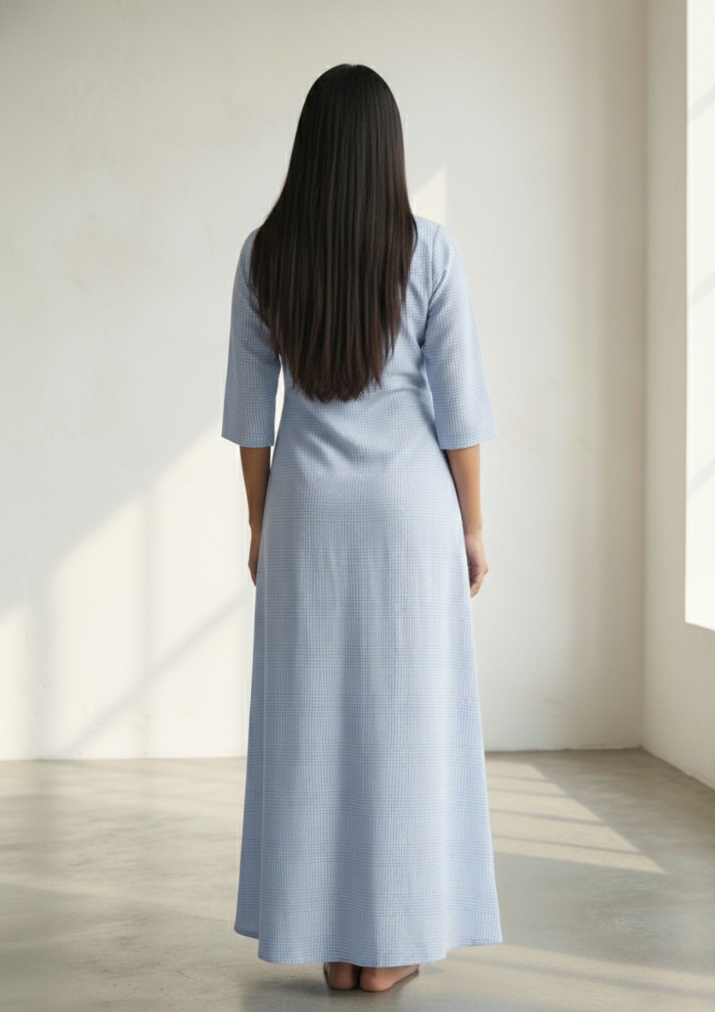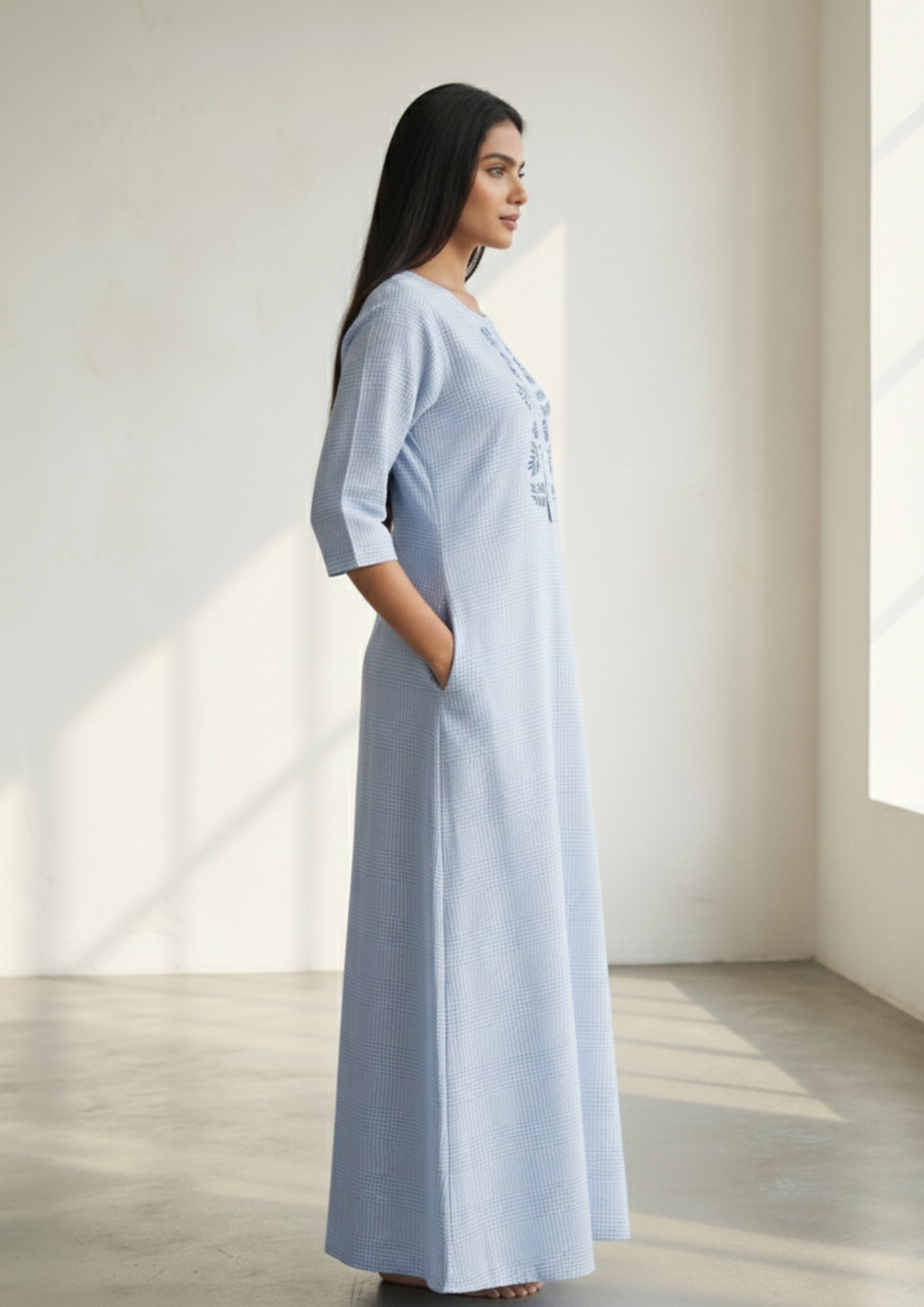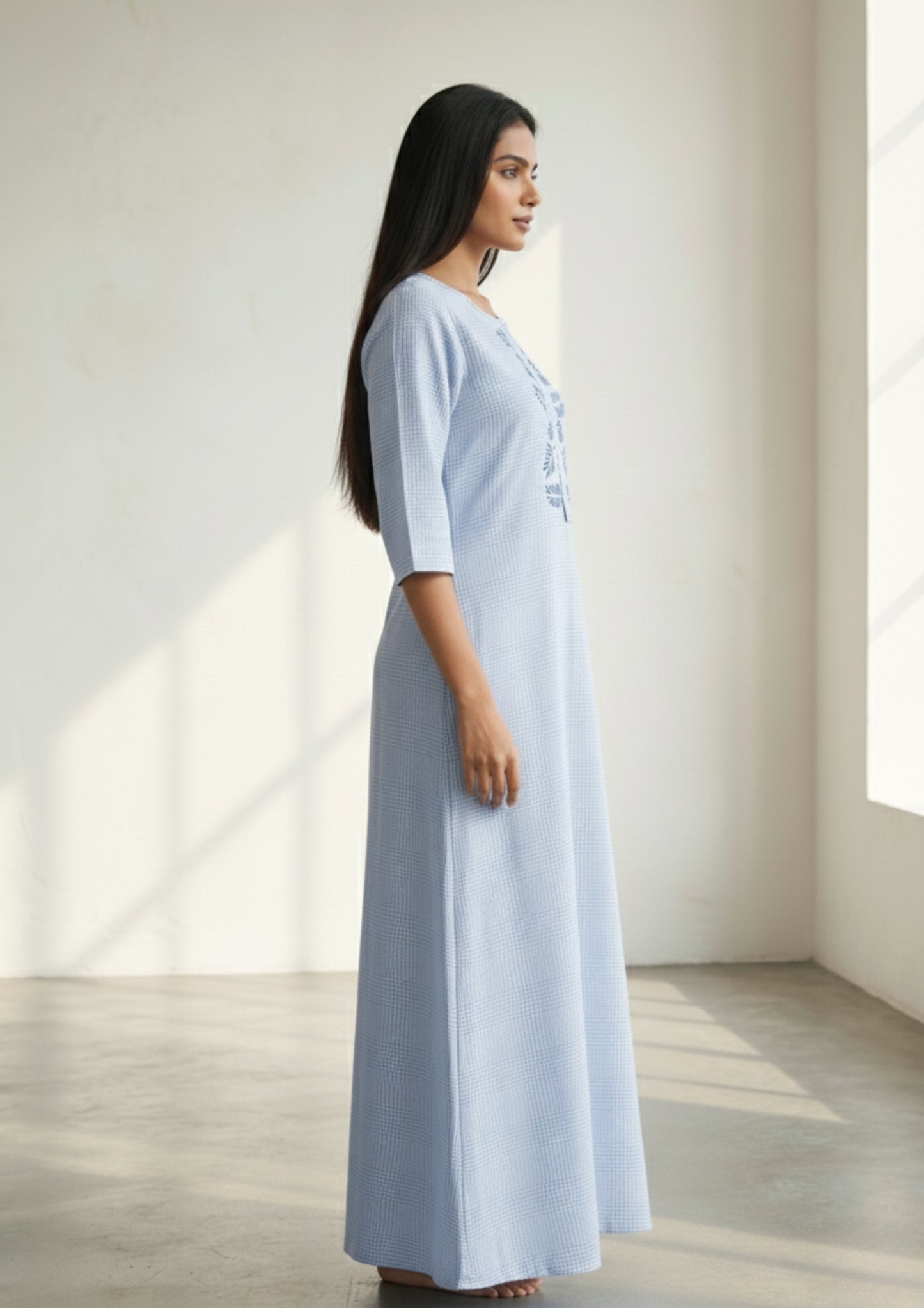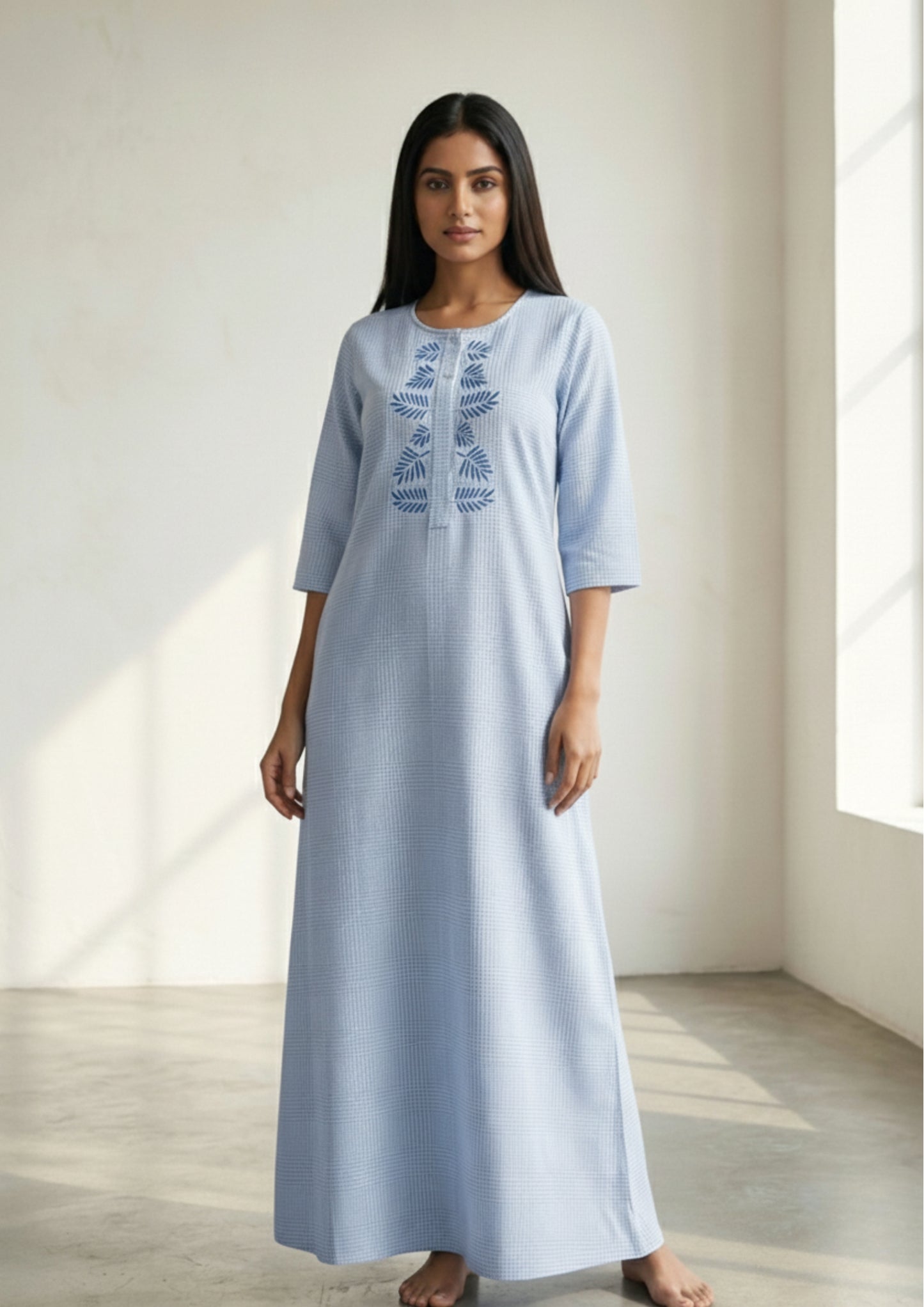 The minimal embroidered detailing adds a touch of handcrafted charm, while the flowing full-length design ensures ease of movement and cozy coverage. Thoughtfully made for women who value comfort with grace, this nighty is perfect for restful sleep and relaxed days at home.